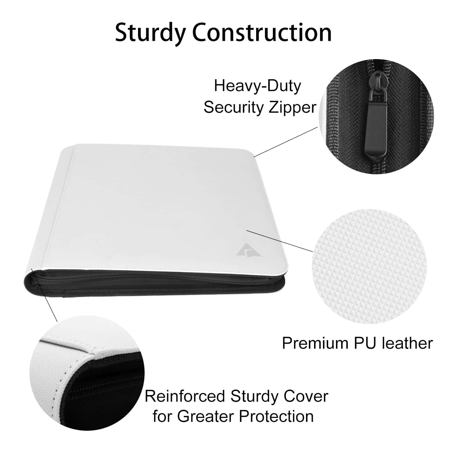 Rieton Carpeta de Cartas de 12 bolsillos con más de 800 bolsillos, carpeta de álbum de cartas sin anillas y con bolsillos de carga lateral para TCG – Blanco. Construcción premium: la cremallera de calidad mantiene las cartas protegidas e intactas cuando no se utilizan. Tapas delanteras y traseras acolchadas y extra rígidas hechas de material antideslizante y resistente al agua. Páginas premium: bolsillos de carga doble cara con respaldo negro de baja fricción, creando una separación entre los bolsillos delanteros y traseros, así como proporcionando a las cartas un aspecto clásico enmarcado. Carga lateral: los bolsillos de carga lateral están diseñados para mantener las cartas de intercambio de forma segura en su lugar. La alta calidad de la cremallera mantiene la carpeta de cartas de intercambio cerrada cuando no está en uso. No más derrames de cartas. Materiales seguros: fabricados con material seguro para archivos, libre de ácidos y no PVC. Garantía de 12 meses a partir de la fecha de compra. Tamaño de bolsillo 3,7 x 2,7 in, compatible con todas las cartas como Magic the Gathering, YuGiOh!, Baloncesto, Béisbol, Fútbol, Fútbol, Star Wars X-Wing, Force Of Will, Cardfight Vanguard, WoW, Panini XL & Match, Dragon Ball Z, y muchas más. Compatible con todas las fundas protectoras de cartas estándar.