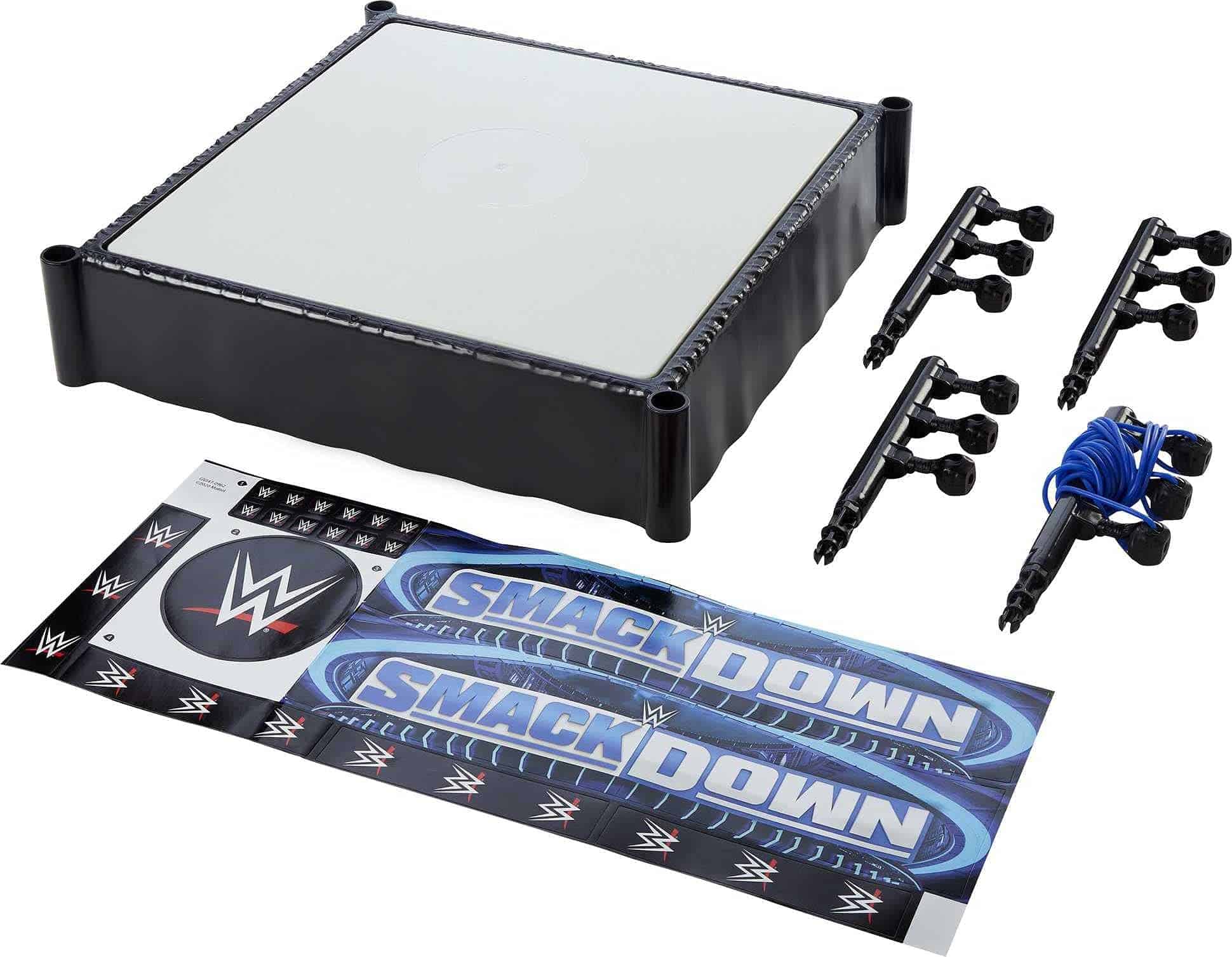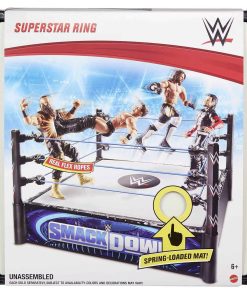 Recrea la acción en el ring con el Ring de WWE Superstar. El escenario central para los eventos principales en cada arena, este auténtico ring de 14 pulgadas / 35.56 cm cuenta con cuerdas de flexión real para lanzar ataques y una manta cargada por resorte para un rebote extra de los golpes. ¡Coge tus figuras de acción favoritas de WWE Basic, Elite Collection, y Ultimate Edition (cada una se vende por separado) y juega el combate del año cualquier día de la semana! ¡Los colores y decoraciones pueden variar!