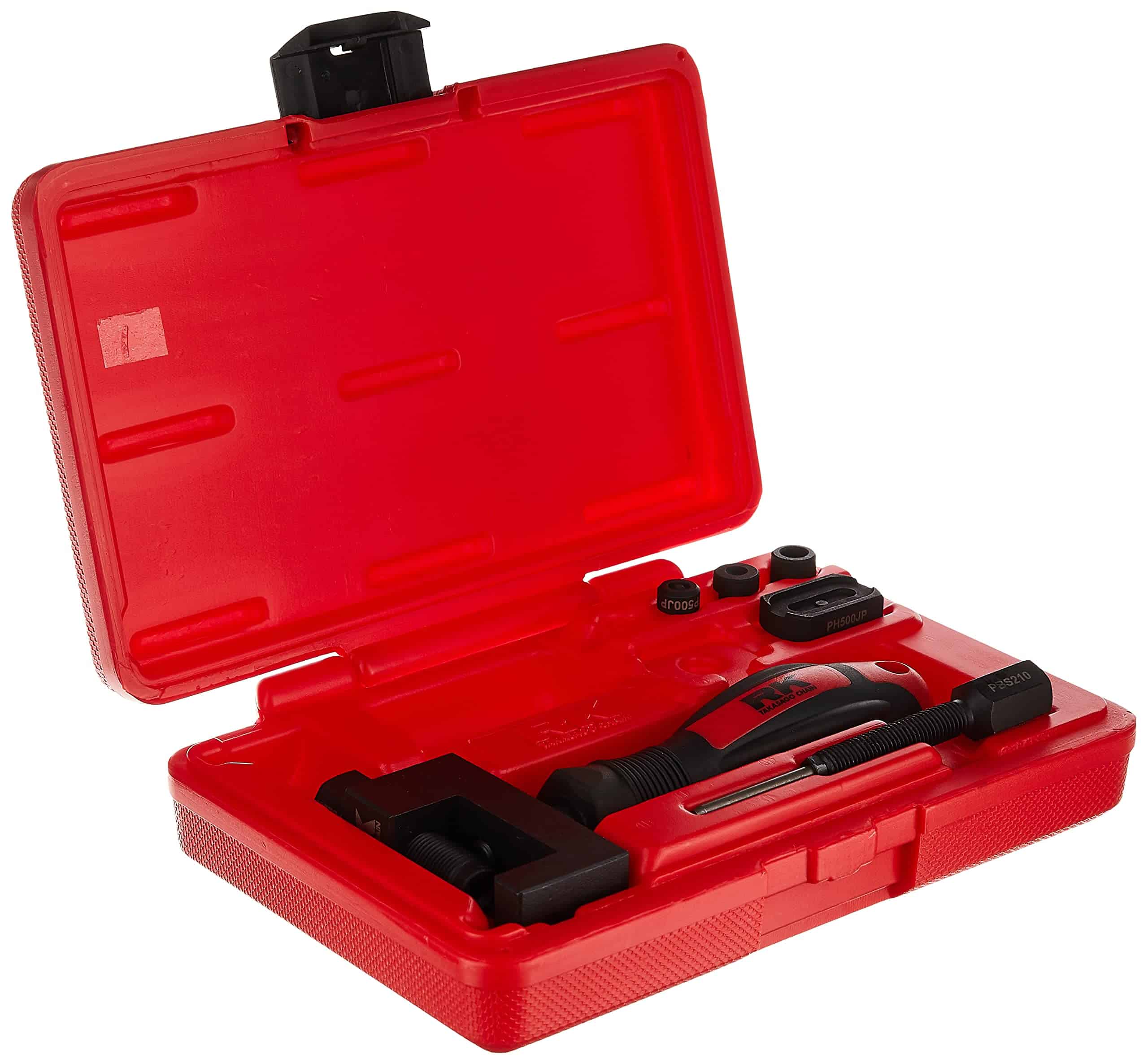 Rompe rápidamente y fácilmente cadenas de tipo 40 y 50. Presiona fácilmente las placas laterales de la cadena de tipo 40, 50 con tolerancia ajustada a la profundidad correcta para la instalación de clips o remaches. Expande los eslabones de remache especiales de RK. El nuevo diseño permite que los componentes se bloqueen en el cuerpo de la herramienta y un perno de presión más grande para un uso más fácil sin que los componentes de la herramienta se caigan. Nota: La herramienta no puede remachar cadenas de tipo 420/428 sin (FP428JP & PH428) vendidos por separado. Mango Sure-Grip rediseñado y número de parte grabado con láser para facilitar la identificación de piezas. La nueva placa portaobjetos de ajuste a presión cuenta con un poste reversible para alternar entre placa de clip y placa de remache. El Pin de Expansión de Remache rediseñado ahora presenta una protección para evitar remachar en exceso. Garantía limitada de por vida en material y artesanía del cuerpo de la herramienta.