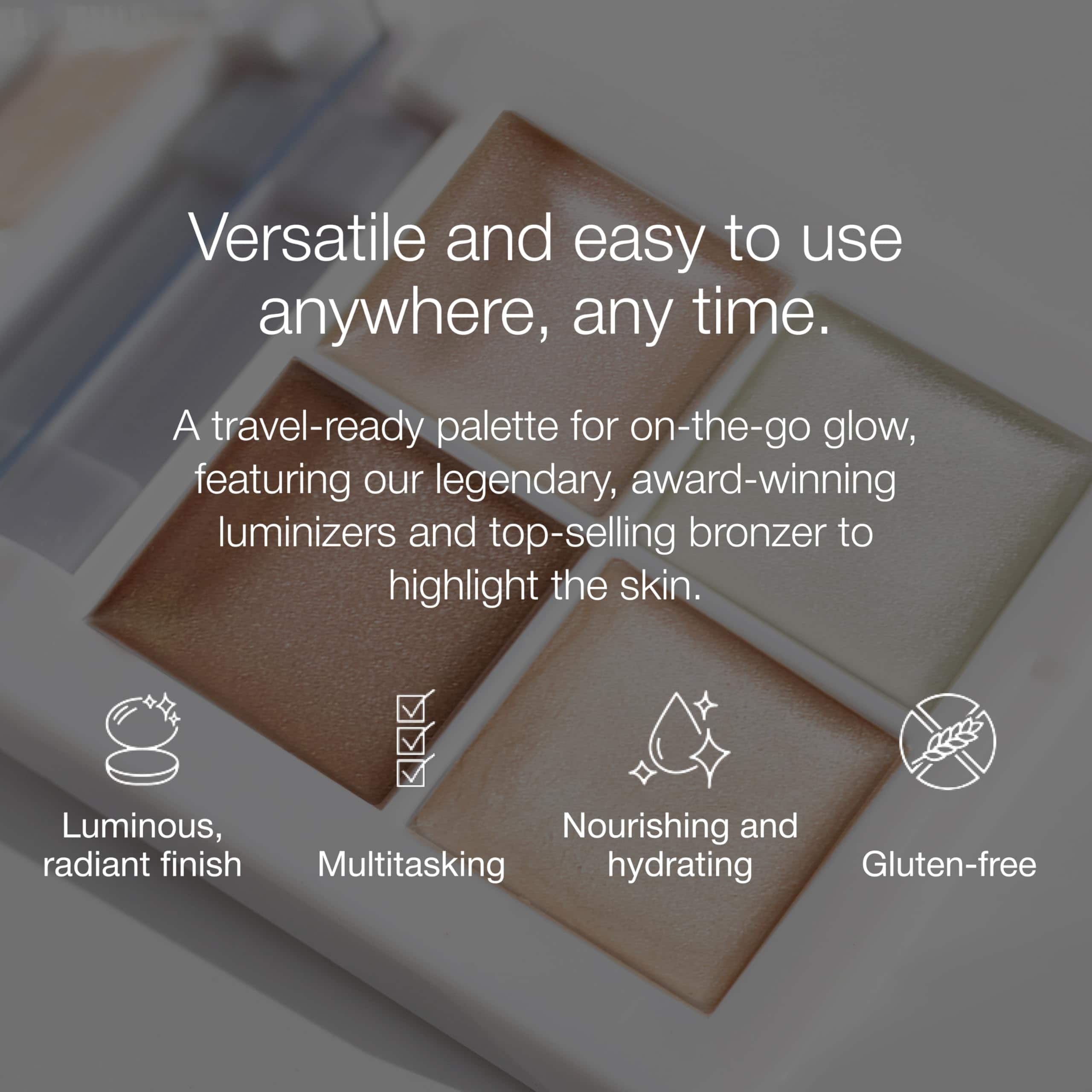 Paleta de 4 resaltadores en crema especial que despiertan la piel con un brillo reflejante de RMS. Perfecto para resaltar pómulos, ojos y labios para un acabado luminoso sin verse grasoso o pesado. Estos tonos seleccionados se funden en la piel, nutriéndola e hidratándola a medida que ofrecen un brillo radiante y refinado. Esta paleta contiene los resaltadores en los tonos Living, Champagne Rose, y Magic, y el Bronceador Buriti. Puedes combinar los tonos para un brillo personalizado o usarlos individualmente para resaltar pómulos, ojos al centro y arco de cupido. También se pueden aplicar en labios o párpados para un brillo adicional y un aspecto nacarado moderno más completo. Creemos firmemente que debes confiar en tus productos de belleza, por lo que los nuestros están libres de: parabenos, gluten, fragancias sintéticas, OGM, sulfatos, ftalatos y talco. También contamos con socios de fabricación que utilizan instalaciones certificadas GMP. Rose-Marie Swift es RMS Beauty, y RMS Beauty es Rose-Marie Swift, una marca que representa la belleza limpia sin compromisos, la meticulosa selección de ingredientes y un futuro brillante y continuamente innovador. Magistralmente hecho, bellamente limpio.