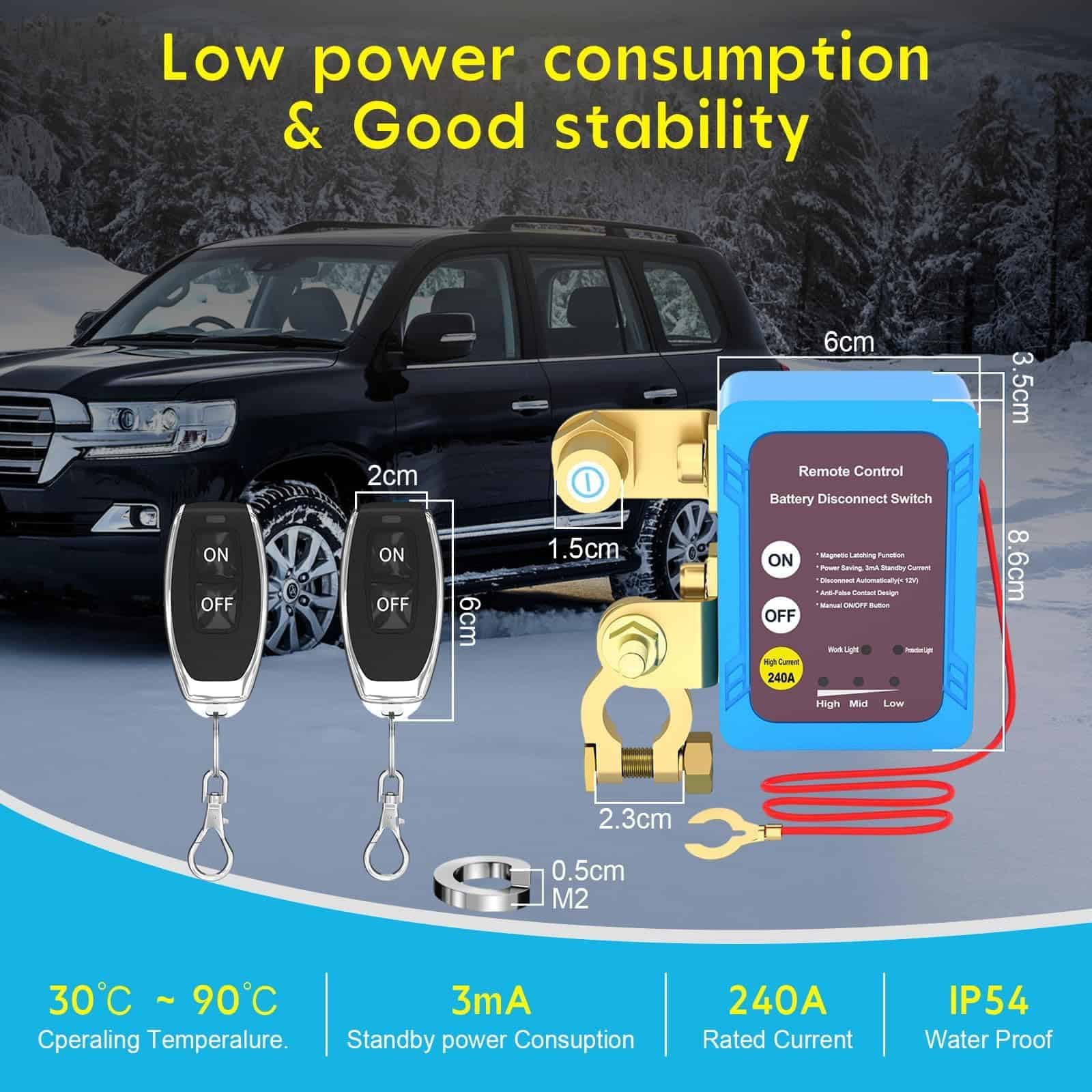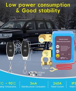 1. Potencia – Rendimiento Eficiente y Estable Nuestro interruptor de encendido/apagado de alto nivel para coche es una maravilla de la ingeniería. Con una corriente nominal de 240A y un voltaje nominal de 12V, este interruptor de desconexión de batería remoto de 12V 240A está diseñado para manejar las demandas de energía de su vehículo con facilidad. El consumo de energía en espera de solo 3mA garantiza un drenaje mínimo de la batería, convirtiéndolo en una solución ideal para desconectar la batería. Opera en un amplio rango de temperatura que va desde -22 F a 194 F, junto con un umbral de fallo de energía de 11.6V – 12V y una corriente instantánea de 500 A, ofrece una estabilidad inquebrantable, ya sea que esté conduciendo un coche, camión o RV. 2. Característica Antirrobo de Detección de Voltaje Inteligente Este interruptor de desconexión de voltaje inteligente es un cambio de juego para la seguridad del vehículo. Cuando el voltaje de la batería cae por debajo de 11.8V, corta automáticamente la energía después de 120 segundos, ahorrando energía y protegiendo su batería. Por el contrario, cuando el voltaje supera los 13.2V, el control remoto se deshabilita, permitiendo solo la operación manual para evitar cortes de energía accidentales durante el viaje. Como interruptor antirrobo de coche, utiliza un relé de nuevo tipo con principios magnéticos para el control del circuito, proporcionando una seguridad y eficiencia energética mejoradas. 3. Prolongue la Vida Útil de su Batería Diga adiós a los problemas de agotamiento de la batería. Nuestro interruptor de desconexión de batería para coche protege su batería del desgaste prematuro causado por estacionamientos prolongados, cableado envejecido o descuidos. Al maximizar la retención de energía, extiende eficazmente la vida útil de su batería de coche, ya sea en un vehículo de 12V, un camión o un RV. Este interruptor de desconexión de batería para coche es imprescindible para cualquiera que busque ahorrar en costos de reemplazo de batería. 4. Kit Completo e Instalación sin Problemas Al comprar nuestro interruptor de desconexión de coche, recibirá un paquete completo. Incluye 1 interruptor de corte, 2 controladores remotos, 1 manual, 1 tuerca, 1 espaciador dorado, 2 espaciadores plateados y 1 hoja de amortiguación. Instalar este interruptor de desconexión remoto para coche es muy sencillo, gracias al método de enlace negativo. Simplemente siga las instrucciones fáciles de entender. Recuerde apagar la energía antes de la instalación y realizar una prueba de encendido después. 5. Compatibilidad Versátil y Precauciones de Instalación Esta interruptor de desconexión es compatible con la mayoría de los vehículos de 12V, incluidos autos, botes, RV, remolques, camiones, ATVs, UTVs y motocicletas con desplazamientos menores a 4.0. Es adecuado para polos negativos de tamaño 9-13 mm y 15-17 mm, pero no para vehículos con cabezales de pila pequeños. Antes de realizar el pedido, mida el compartimento de la batería de su vehículo, ya que el interruptor mide 3.3″x2.4″x1.4″. Asegúrese de que haya suficiente espacio para la instalación y el cierre adecuado del capó.