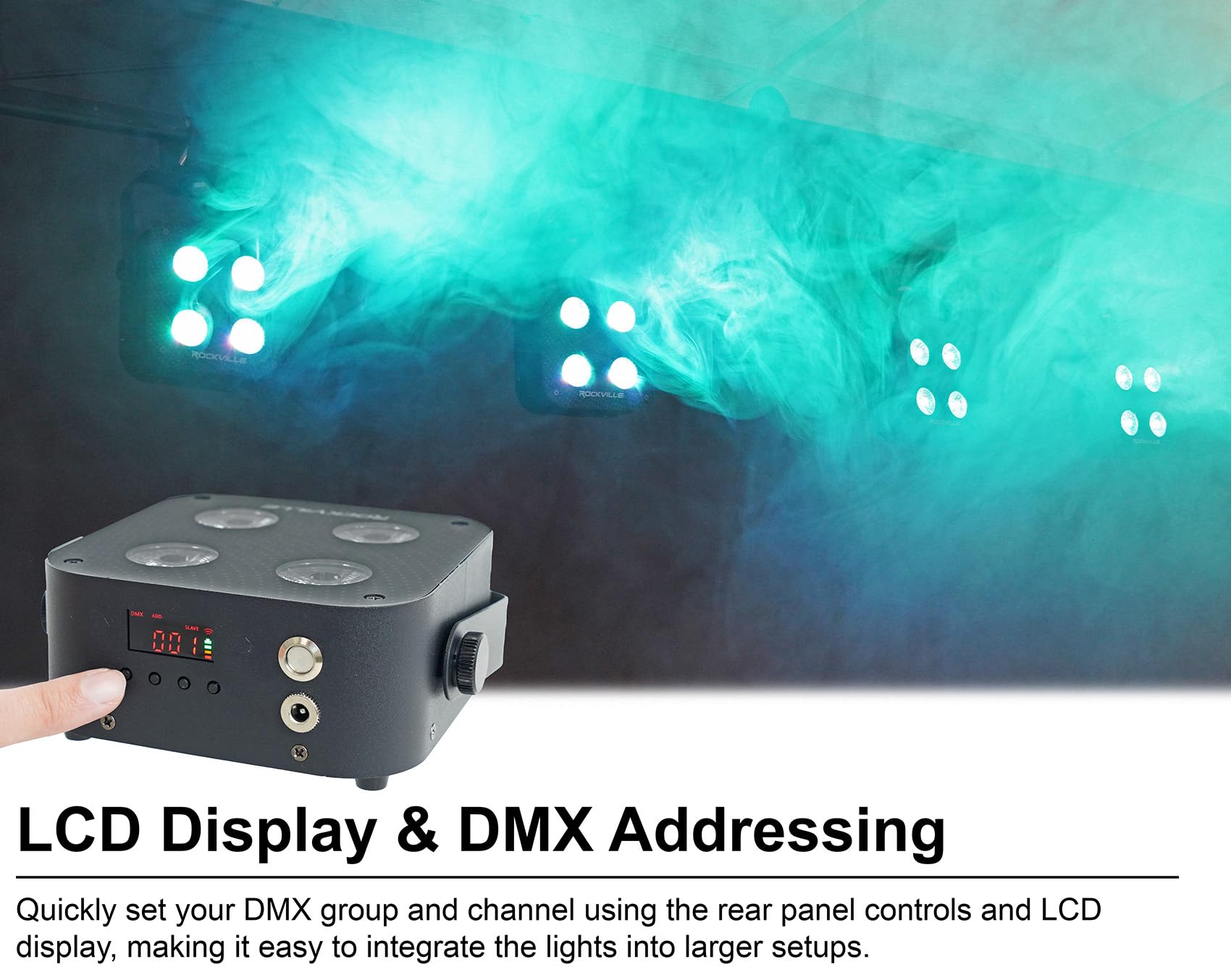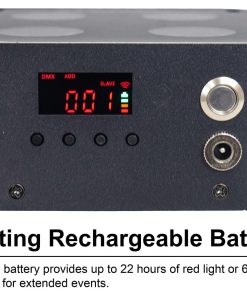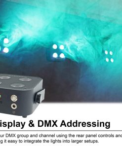 2. VISOR LCD Y DMX DIRECCIONABLE (NUEVO EN V2): El nuevo visor LCD permite configuraciones fáciles de grupo/canal DMX, mejorando la experiencia del usuario. Configura direcciones DMX exactas para una integración perfecta en tu configuración.