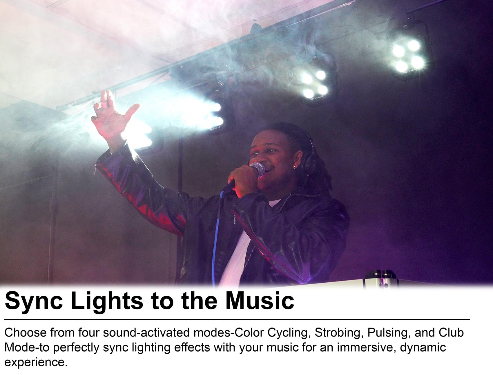 5. 4 MODOS DE SONIDO Y 6 RUEDAS DE COLOR: Elige entre 4 modos de sonido, incluyendo ciclos de colores y efectos de estrobo de club intensos. 6 ruedas de color con 48 colores y control de brillo, todo accesible a través del control remoto, no se necesita controlador DMX.