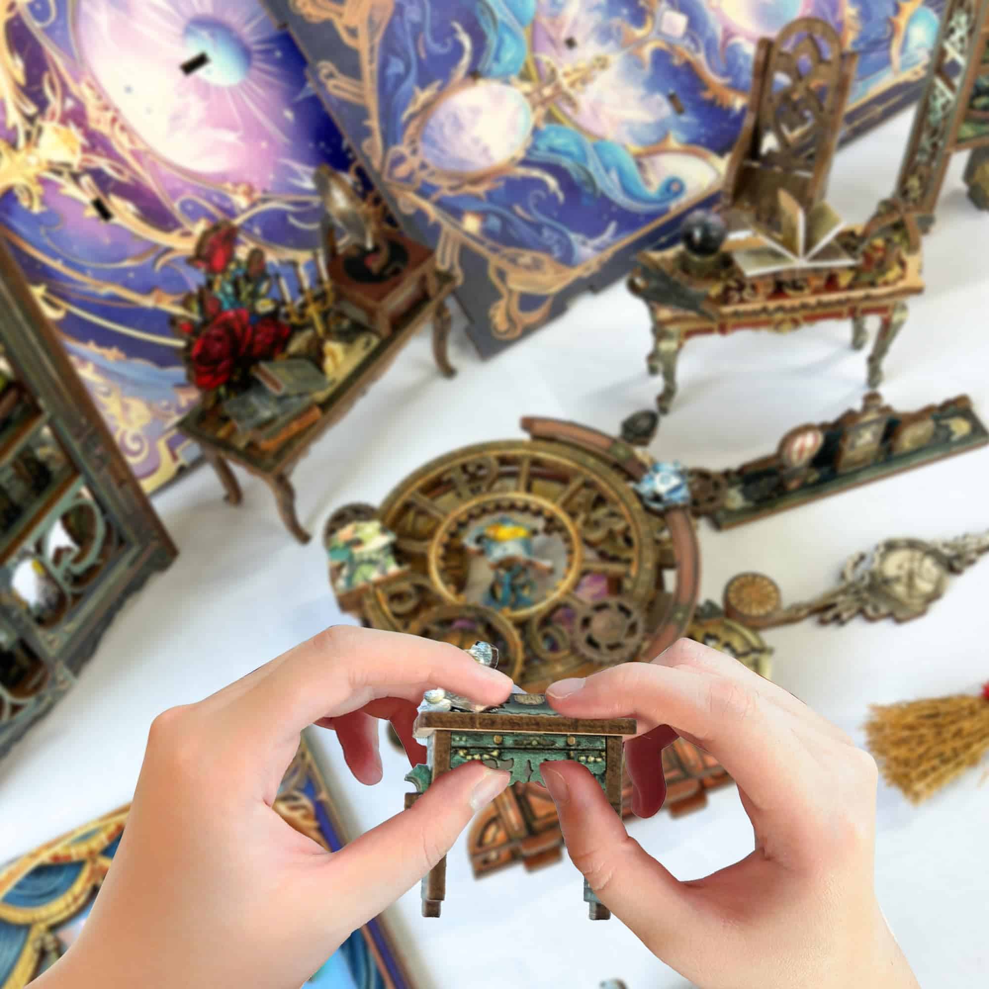 Nombre: Fantasy Store Dimensiones: 285 mm x 175 mm x 110 mm Materiales: Madera de alta calidad, acrílico, papel, luces LED con interruptor táctil Dificultad: Tiempo estimado de montaje: 10-15 horas, dependiendo de las habilidades individuales de manualidades. Incluye en el paquete: 1x Kit de estantería en miniatura DIY (incluye todas las piezas y herramientas de montaje), 1x manual de instrucciones detallado, 1x luces LED de doble color con interruptor táctil. Peso: 2.4 lb Fuente de alimentación: Requiere 3 pilas AA (no incluidas). Edad recomendada: A partir de los 15 años Nota importante: Debido a restricciones de transporte aéreo, el pegamento y las pilas AA no están incluidos en el paquete. Por favor, cómpralos por separado. Advertencia: Contiene piezas pequeñas. Peligro de asfixia para niños menores de 3 años. Manipular con cuidado durante el montaje para evitar dañar las piezas delicadas.