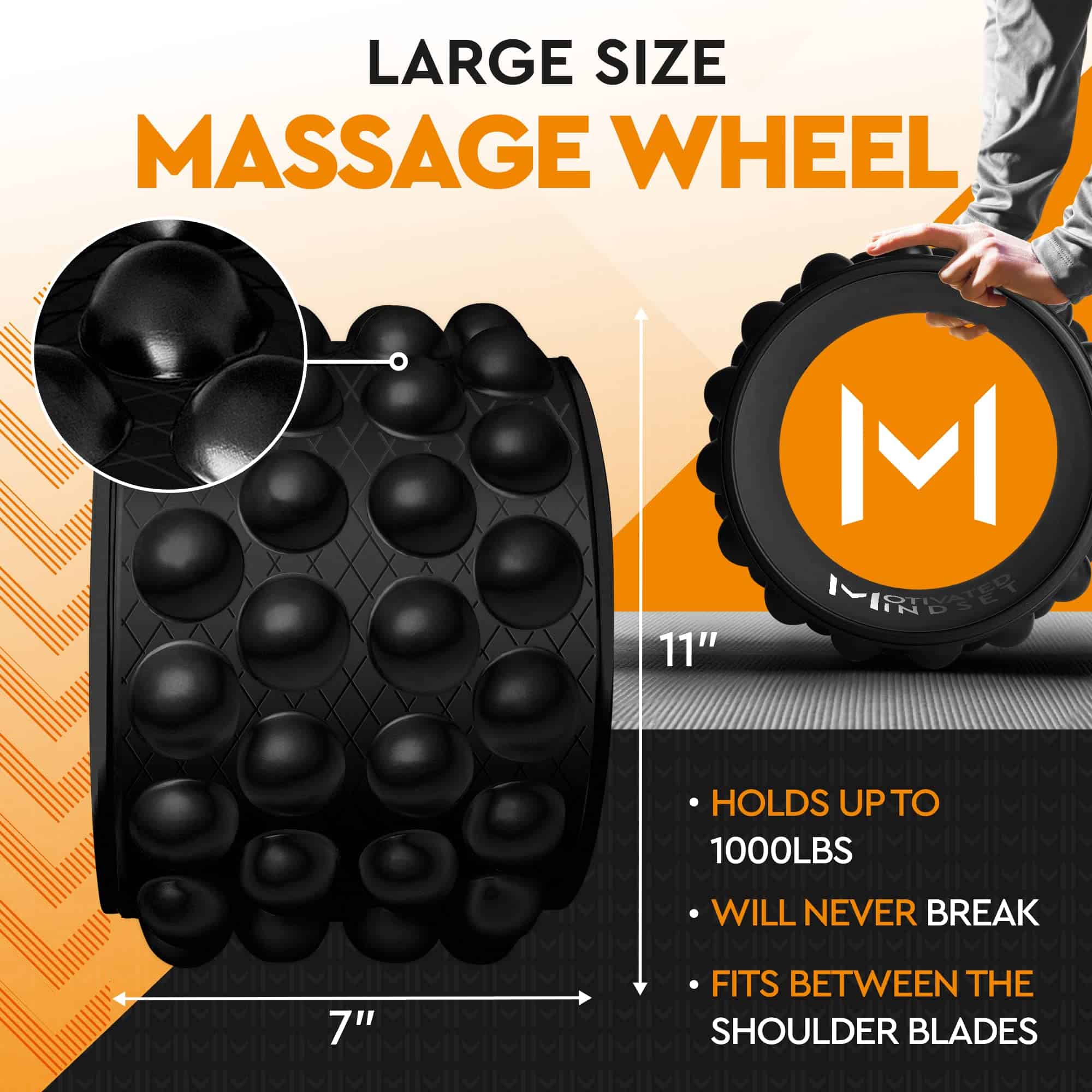 1. Este rodillo de estiramiento para la espalda está diseñado para ayudar a estirar la columna vertebral, piernas y hombros. El rodillo de rueda para la espalda es un excelente accesorio para el yoga y más allá. Mejora tu movilidad y flexibilidad para lograr posturas más desafiantes. Las ruedas para crujir la espalda establecen la flexibilidad y el equilibrio del cuerpo; también puedes usar rodillos de espuma para masajes musculares. 2. Nuestra rodillo de yoga para dolor de espalda está hecha con una superficie texturizada con cuatro hileras de protuberancias diseñadas para corregir la curvatura de la columna vertebral. La única con cuatro hileras de protuberancias que apuntan a los músculos a ambos lados de la rueda de roller de la columna también es ideal para otros ejercicios corporales. También puedes ejercitar tus abdominales, pecho, muslos y más. 3. Esta ranura espinal en la rueda de rodillo de ejercicio de yoga está diseñada para relajar los músculos a ambos lados de tu espalda sin ejercer demasiada presión sobre ellos. Este rodillo estirador de espalda es ideal para ayudar con las posturas en la esterilla y funciona de maravilla como una herramienta de masaje al aliviar la rigidez muscular. El rodillo de masaje rueda se puede usar para masajear y relajar los tejidos miofasciales. 4. Esta espuma EVA de alta densidad garantiza que la rueda de rodillo de masaje será cómoda de usar pero lo suficientemente resistente como para soportar un uso regular dentro y fuera de la esterilla. La altura del rodillo para alivio del dolor de espalda es de 11 pulgadas y el ancho es de 7 pulgadas, que es el doble del ancho de otros rodillos ordinarios. Te sentirás seguro, cómodo y estable cuando lo uses para un masaje de espalda. 5. En nuestra empresa, la calidad es lo que buscamos. Nuestra prioridad es asegurarnos de que estés completamente satisfecho con tu pedido de Rodillo de Espalda MM Massage Back Wheel. Es por eso exactamente por lo que manejamos toda la fabricación que se realiza en nuestra ropa. Si surge algún problema con nuestro Rodillo de Masaje de Tejido Profundo para dolor de espalda y estiramiento, nuestro equipo de soporte nacional está listo para ayudarte.