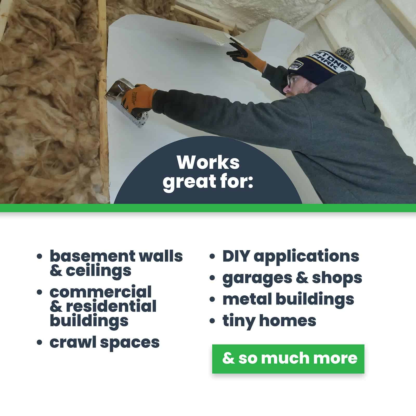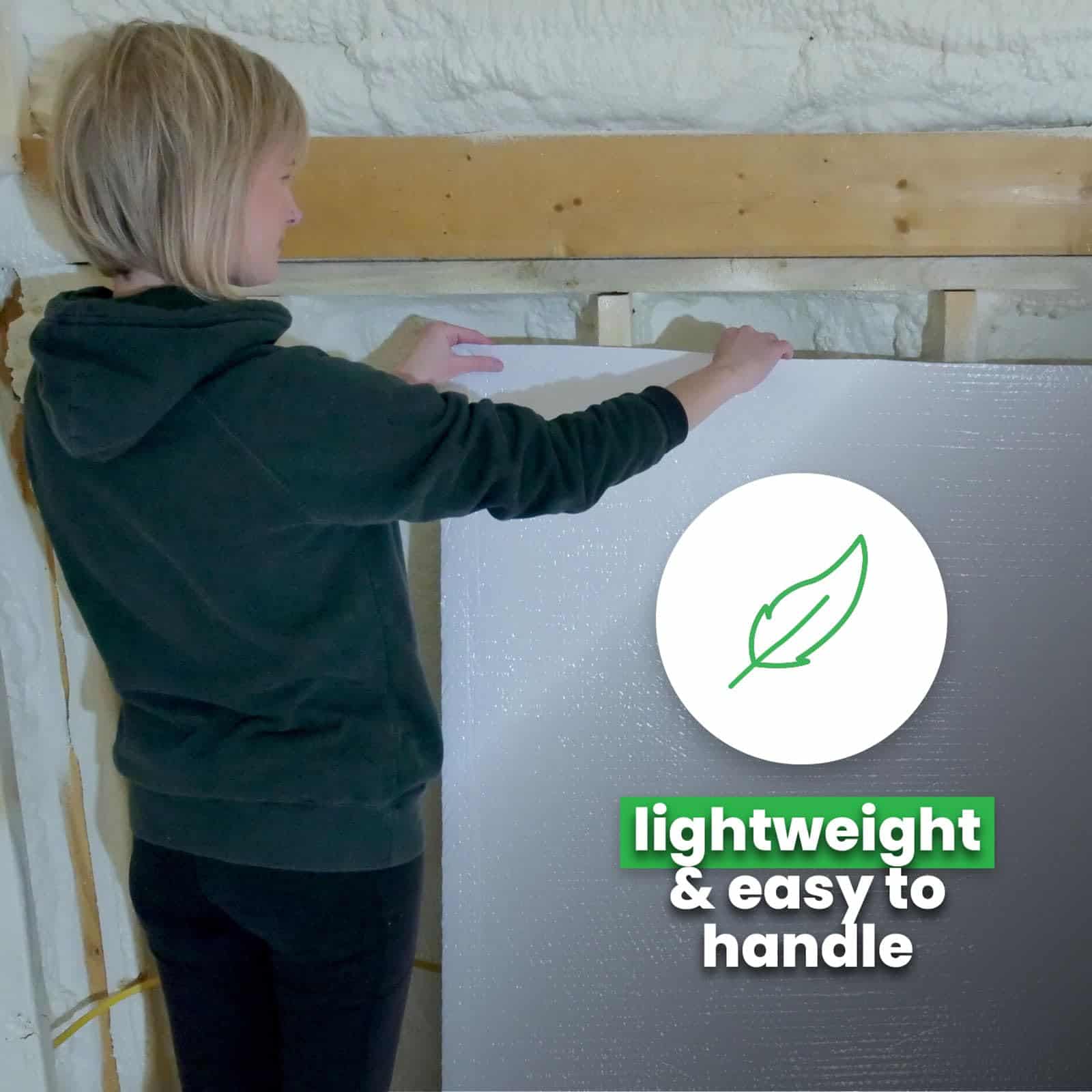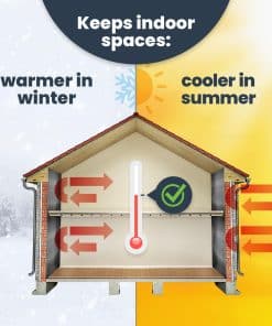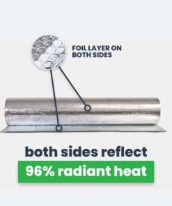 2. REDUCE EL USO DE ENERGÍA – Nuestro aislamiento térmico ligero reduce los costos de calefacción y aire acondicionado bloqueando el 96% del calor radiante. El aislamiento reflectante doble mantiene los espacios interiores cálidos en invierno y frescos en verano. Hecho en Canadá.