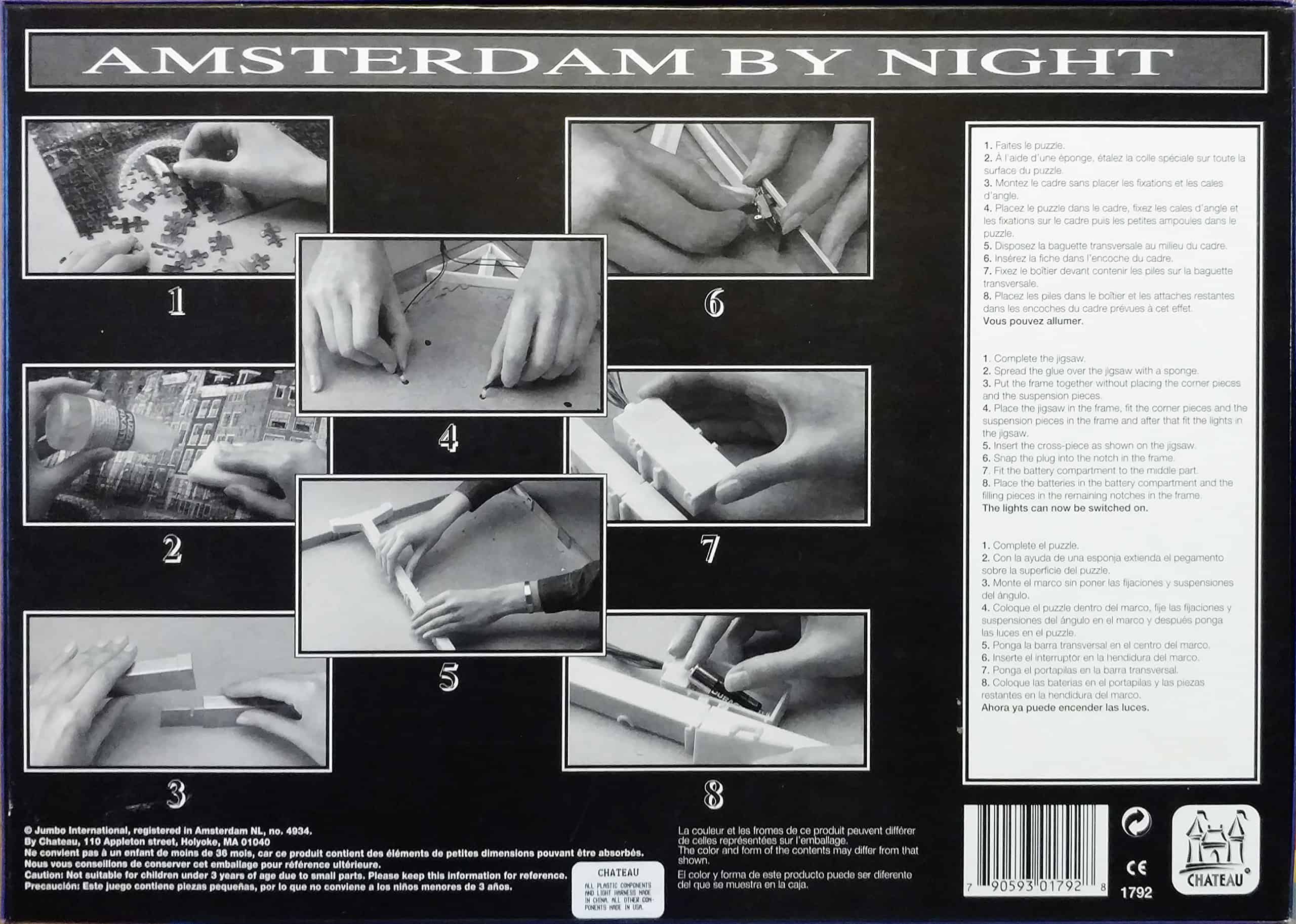 Amsterdam By Night es un rompecabezas de 1,000 piezas de una escena de una calle en Amsterdam junto a un río que tiene luces que se encienden cuando se completa. Tamaño del rompecabezas aproximadamente 19″ x 27″. Requiere 2 pilas «AA» – No incluidas.