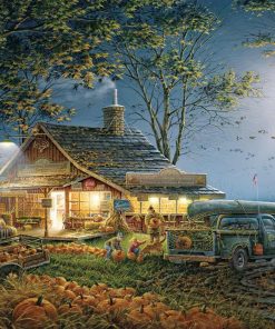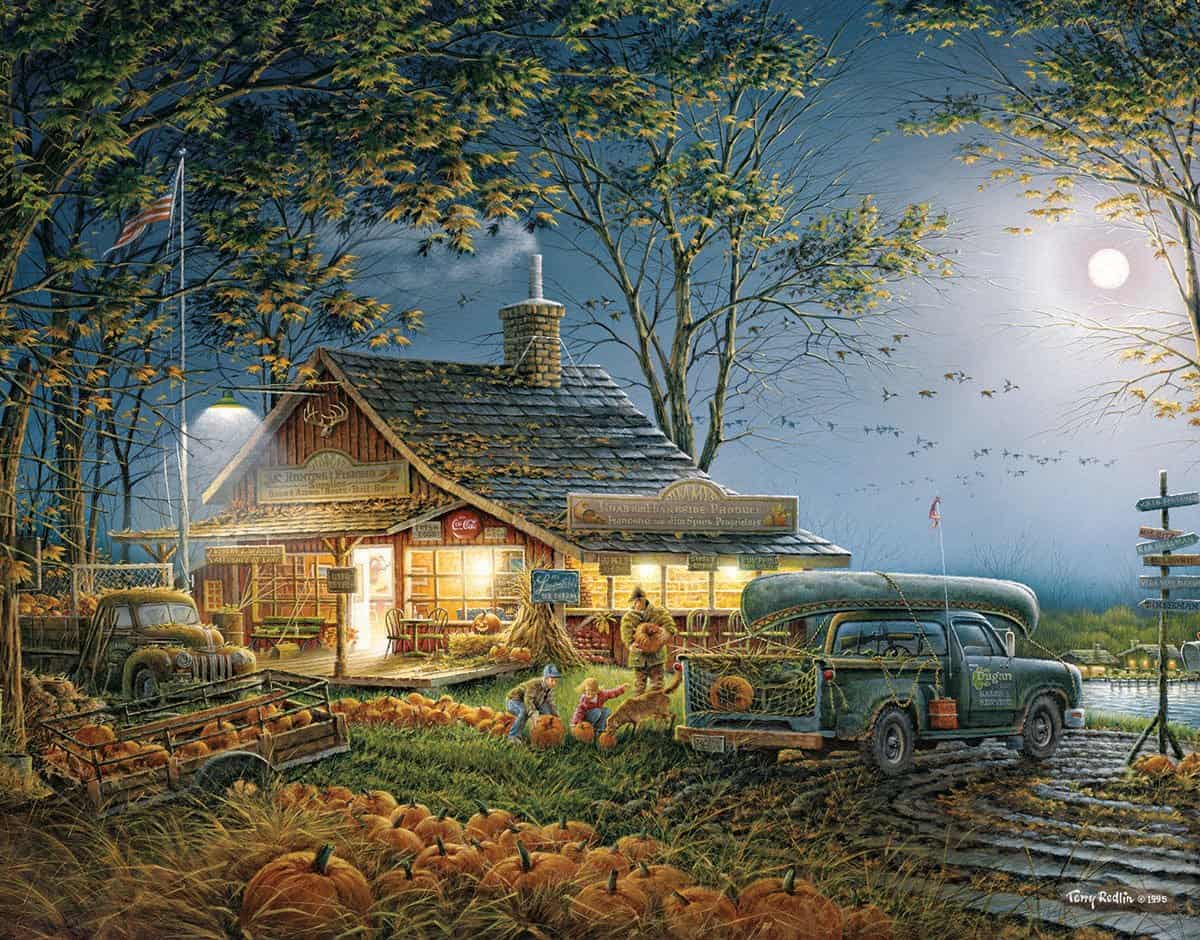 Los niños están eligiendo la calabaza justa bajo la luz de la luna en esta fresca y crujiente noche de otoño. Artista – Terry Redlin: Artículo 609: Rompecabezas de 1000 piezas: Tamaño completo 24″ x 30″.