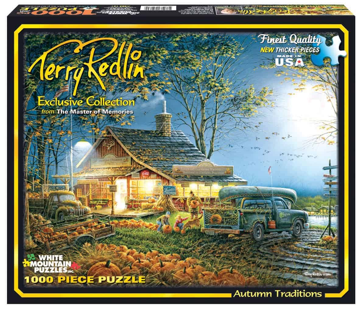 En este hermoso rompecabezas, los niños están eligiendo la calabaza justa bajo la luz de la luna en una fresca y crujiente noche de otoño. Observa cómo la luz brilla intensamente. Cada una de las 1,000 piezas de este rompecabezas refleja la artesanía vívida de Terry Redlin. Emociona a tu familia y amigos llevando a casa el Rompecabezas Tradiciones de Otoño; horas de diversión y entretenimiento que todos disfrutarán. Terry Redlin es un artista estadounidense conocido por pintar temas al aire libre y vida silvestre, a menudo retratados en el crepúsculo. Sus pinturas muestran colores naturales y paletas, amaneceres y puestas de sol resplandecientes. Los rompecabezas de arte son una forma divertida y económica de disfrutar hermosas obras de arte en primera persona. Los rompecabezas también se utilizan para mejorar habilidades cognitivas; desarrollar coordinación mano-ojo, habilidades motoras finas, resolución de problemas, reconocimiento de formas, memoria y finalización de tareas. El Rompecabezas de Tradiciones de Otoño de White Mountain Puzzles incluye 1,000 piezas únicas e interconectadas hechas de cartón de alta calidad en papel reciclado. Piezas de tamaño extragrande para un manejo fácil. Dimensiones del rompecabezas (completado): 24 x 30 pulgadas. Cada Rompecabezas de White Mountain se fabrica con orgullo en Estados Unidos con una garantía de satisfacción del cliente del 100%.