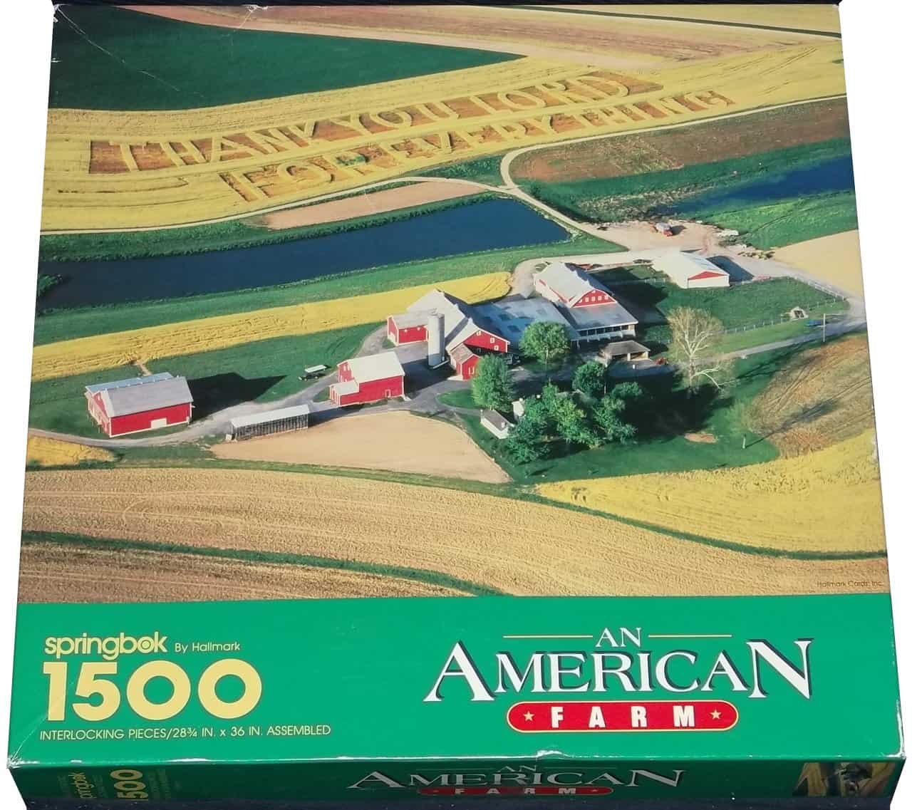 Este rompecabezas de 1500 piezas presenta una granja americana que muestra una vista aérea de la granja con el mensaje «Gracias Señor por Todo» recortado en uno de sus campos de cultivo. Es un rompecabezas Springbok de Hallmark.