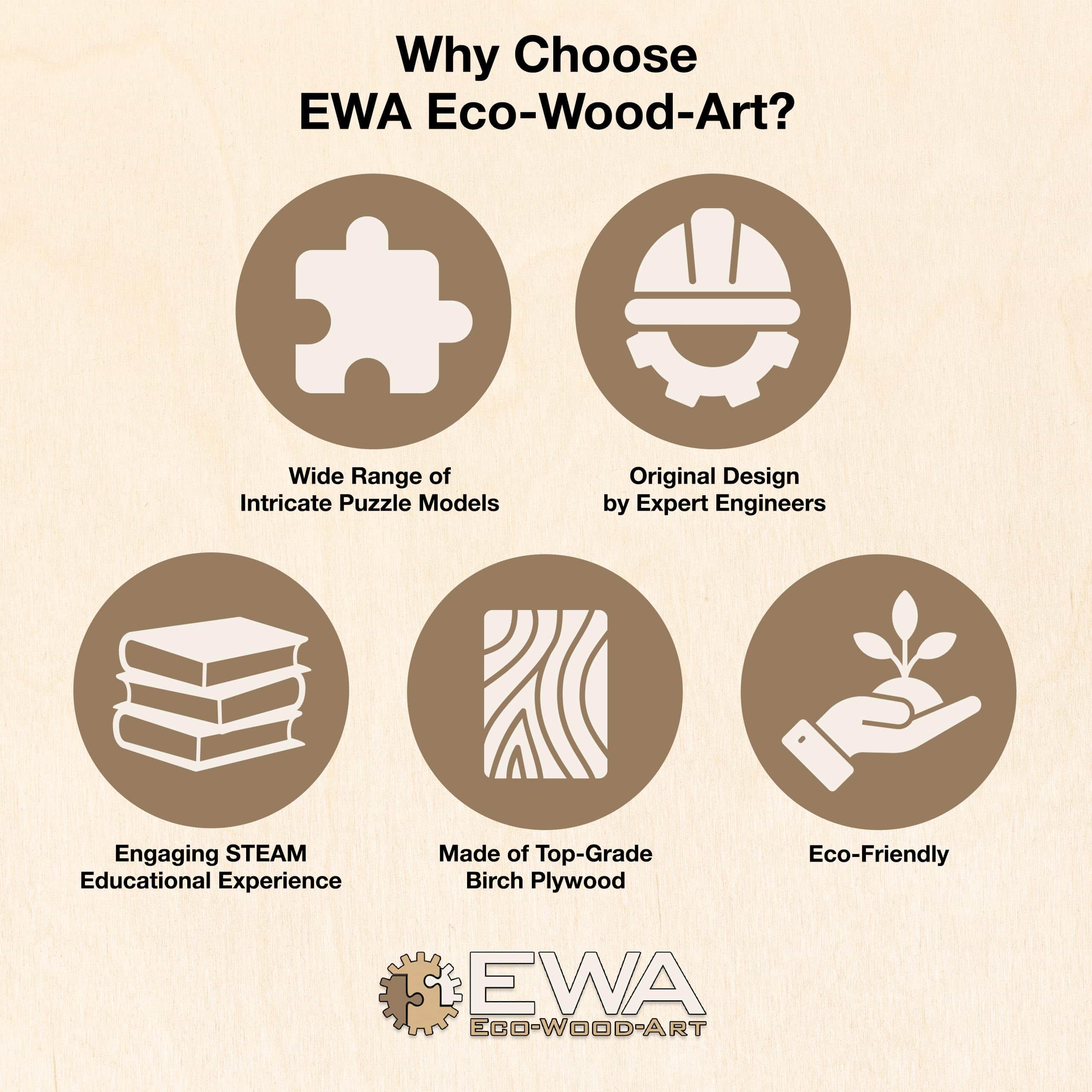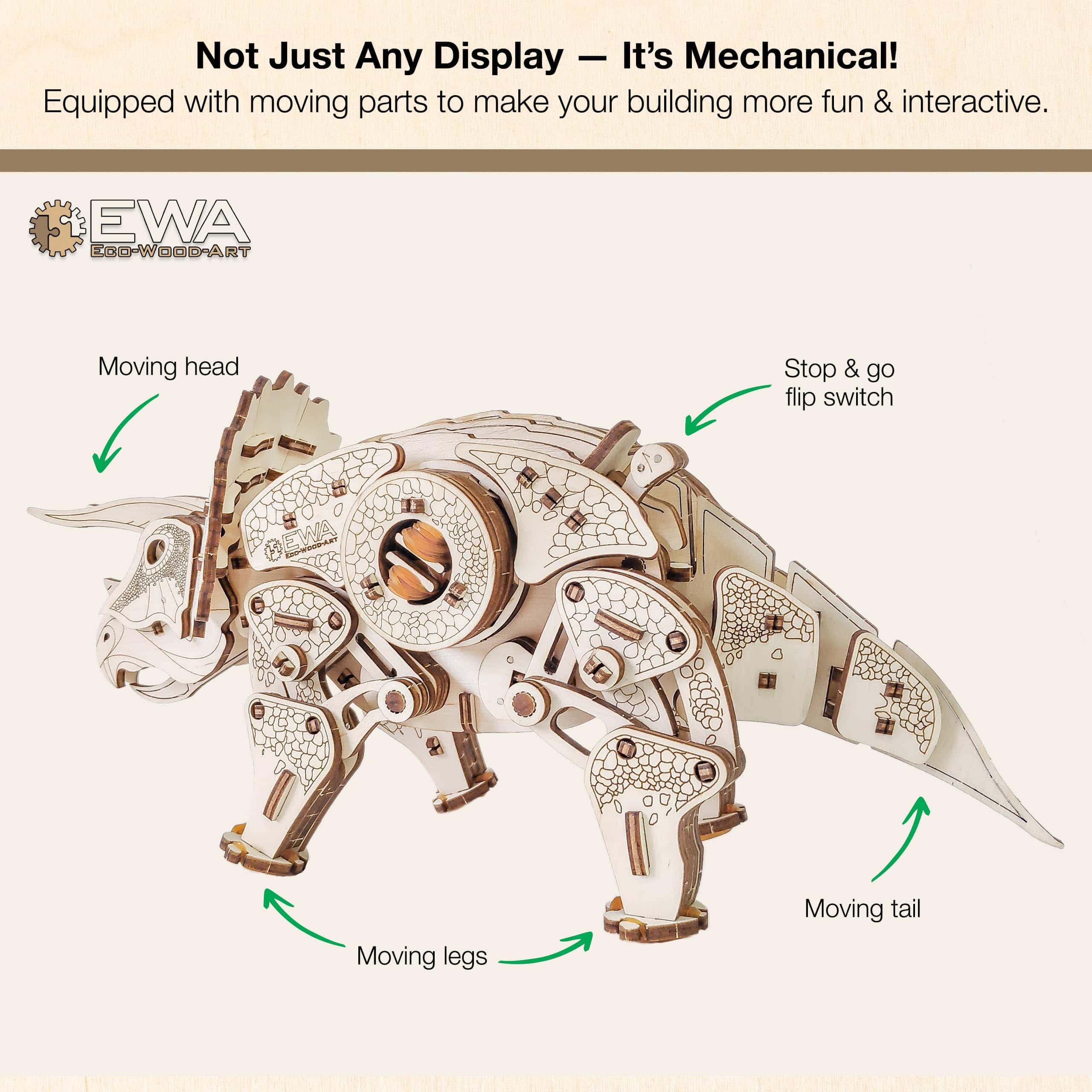 ¡Viaja 65 millones de años al pasado para aprender sobre los dinosaurios con este increíble modelo de TRICERATOPS de madera! Destacado por su diseño, este rompecabezas de madera viene listo para ensamblar (no se necesita pegamento) y está hecho de madera contrachapada segura. El motor de cuerda de bandas elásticas permite que este modelo camine como un verdadero dinosaurio. Con un alto nivel de detalle, incluyendo un patrón de escamas y una cabeza y cola móviles, este elegante modelo en 3D se puede pintar o dejarse en blanco para encajar perfectamente en casi cualquier interior. Si pintas este modelo, se recomienda usar pinturas a base de agua, ya que las pinturas más espesas pueden obstruir los mecanismos. Nuestro compromiso ideal para fomentar la memoria, lógica e imaginación de un niño, los modelos de EWA Eco-Wood-Art son rigurosamente probados para calidad, detalle y funcionalidad. Hemos dedicado nuestros conocimientos de ingeniería para que todos nuestros modelos sean una experiencia gratificante para toda la familia. Aunque este modelo puede resultar demasiado difícil para que los niños más pequeños lo completen por sí mismos, animamos a los padres a que les ayuden, lo que promueve la confianza, el apoyo y el vínculo familiar. Debido a las piezas pequeñas, se recomienda que los niños menores de 14 años estén supervisados por un adulto. ¡Garantía del 100%! Si no estás 100% satisfecho con nuestro producto, contáctanos para un reembolso completo. ¡Mira nuestros otros modelos aquí!