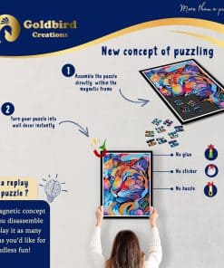 Nuestro rompecabezas y juego de marco incluido ofrece una experiencia única. Las piezas magnéticas se unen fácilmente y se adhieren sin problemas al marco incluido para una experiencia de juego sin complicaciones. Puedes exhibir con orgullo tu obra maestra completa sin necesidad de pegamento, pegatinas o enmarcado adicional. No solo es una forma creativa de resolver rompecabezas, sino también una solución económica para decoración de pared excepcional en tu sala de estar o dormitorio. ¡Disfruta de un rompecabezas de madera de alta calidad con piezas magnéticas de corte preciso que se adhieren perfectamente al marco incluido! Este rompecabezas magnético ofrece un nivel de dificultad desafiante que estimula la creatividad, concentración y resolución de problemas, lo que lo convierte en una excelente actividad familiar. Regala este rompecabezas magnético con marco incluido a tus seres queridos, amigos o colegas para que experimenten el proceso único de armar y exhibir una obra de arte. Es el regalo ideal para entusiastas del arte y los rompecabezas, así como para aquellos que buscan agregar decoración artística a la pared en su espacio.