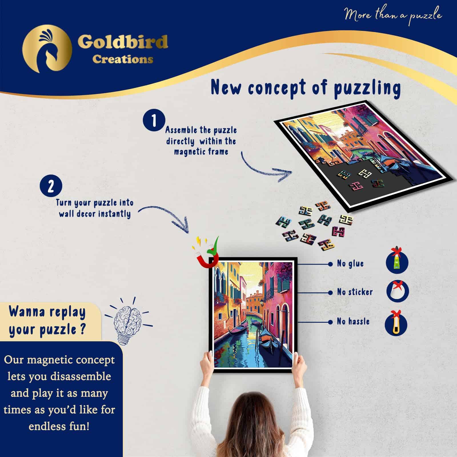 1. Concepto Innovador: Nuestro rompecabezas y set de marco incluido ofrecen una experiencia única. Las piezas magnéticas se unen fácilmente y se adhieren sin problemas al marco incluido para una experiencia de juego sin complicaciones. Luego puedes mostrar con orgullo tu obra maestra completada sin la necesidad de pegamento, pegatinas o enmarcado adicional. No solo es una forma creativa de resolver rompecabezas, sino también una solución económica para una decoración de pared excepcional en tu sala de estar o dormitorio.
