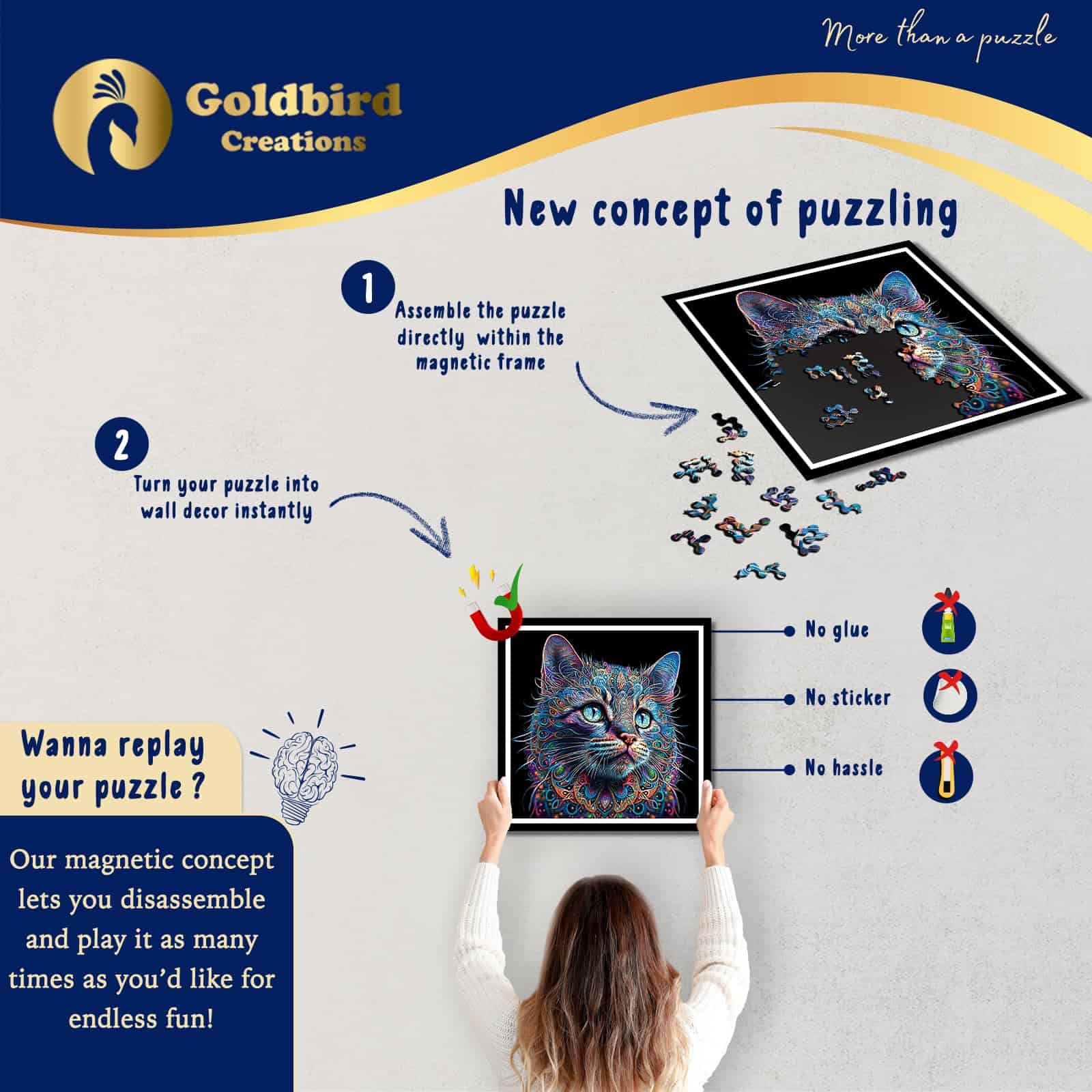 3. ROMPECABEZAS DE MADERA MAGNÉTICO PREMIUM: Disfruta de un rompecabezas de madera de alta calidad con piezas magnéticas cortadas con láser que se adhieren perfectamente al marco incluido, garantizando un ajuste preciso y una experiencia de montaje suave.