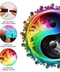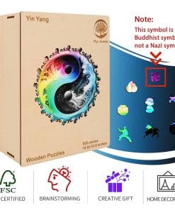 El rompecabezas de madera único Mys Aurora Yin Yang Mandala es una obra de arte inspirada en la naturaleza, con colores vivos y una representación fiel del arte original pintado a mano. Con tecnología de vanguardia, se ha utilizado madera HDF para garantizar una textura extremadamente suave y duradera, con impresión UV y corte láser de precisión de 0.03mm. Este rompecabezas no solo es un desafío para la mente, sino también una pieza de decoración estéticamente hermosa para el hogar.