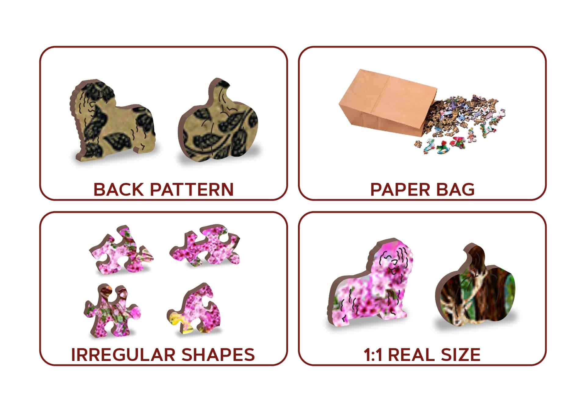 3. PIEZAS CON FORMA DE CRIATURA – ¿Puedes encontrar todas las piezas únicas en forma de rompecabezas? ¡Esparcidas en este rompecabezas hay unas pocas piezas especiales con formas únicas! ¡Buena suerte encontrando todas las formas de madera!
