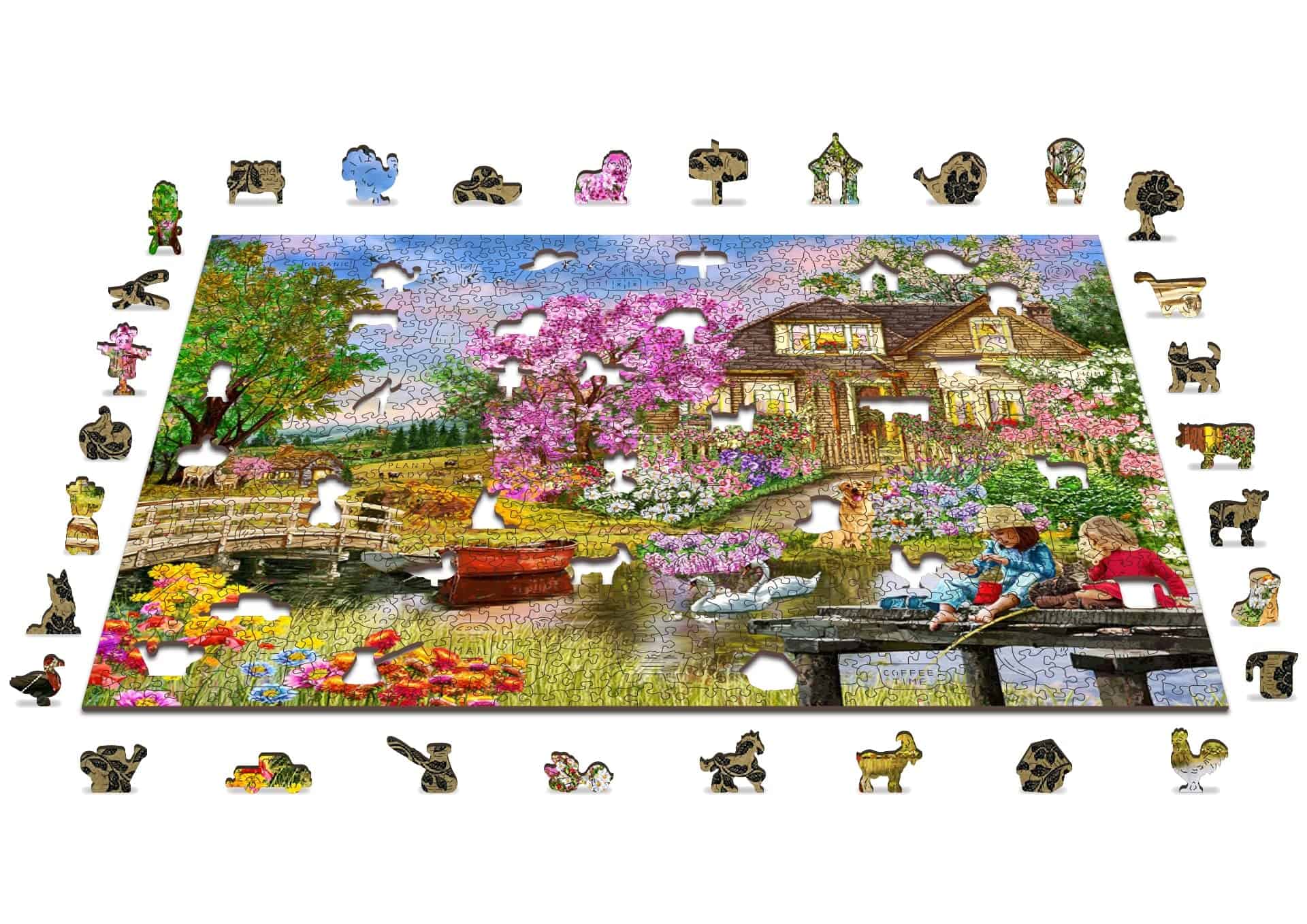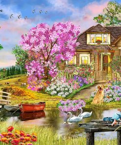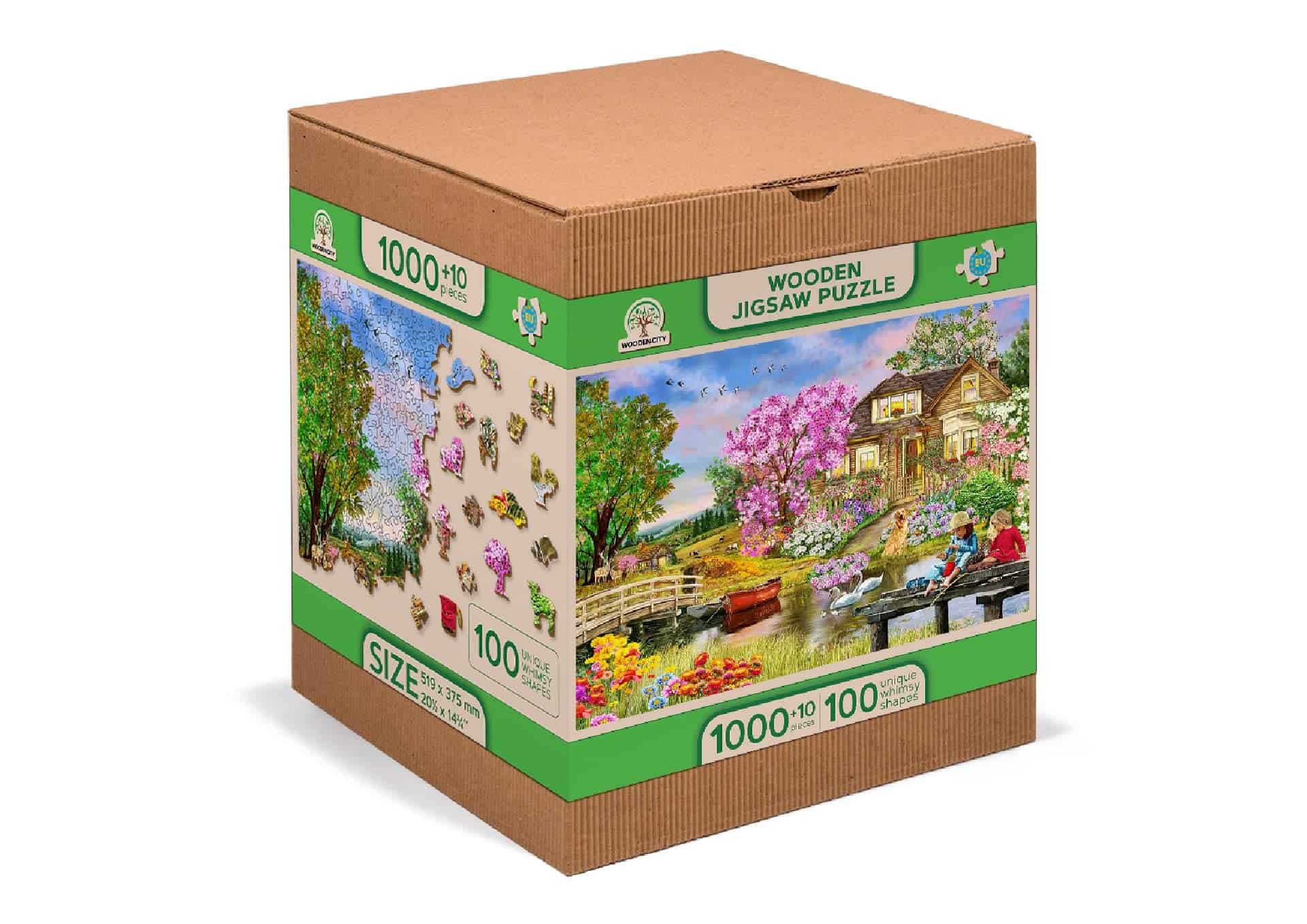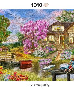 1. ESCAPE AL CAMPO – Pase una tarde de primavera tranquila en una casa de campo junto al lago rodeada de flores en este rompecabezas del campo de 1.010 piezas únicas.