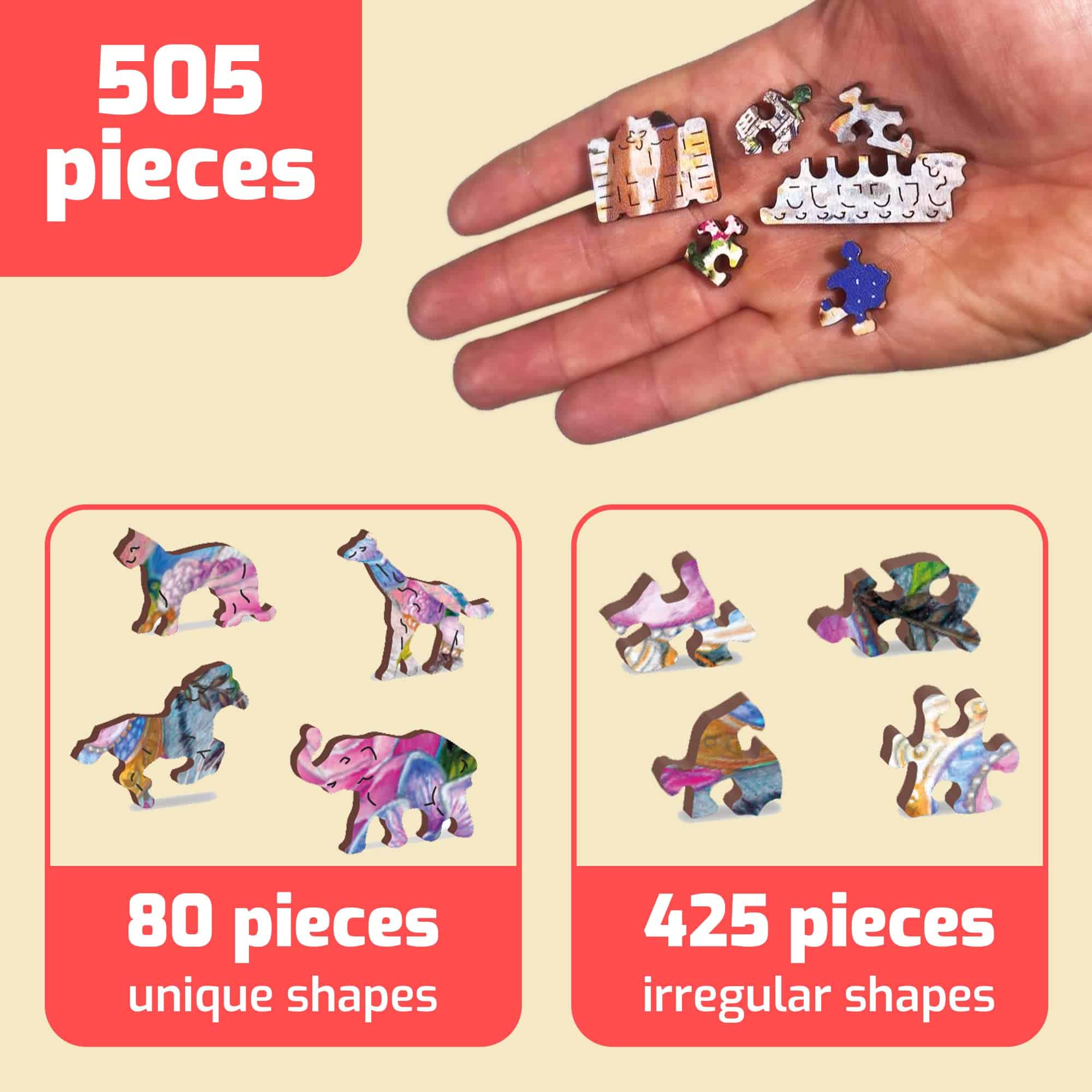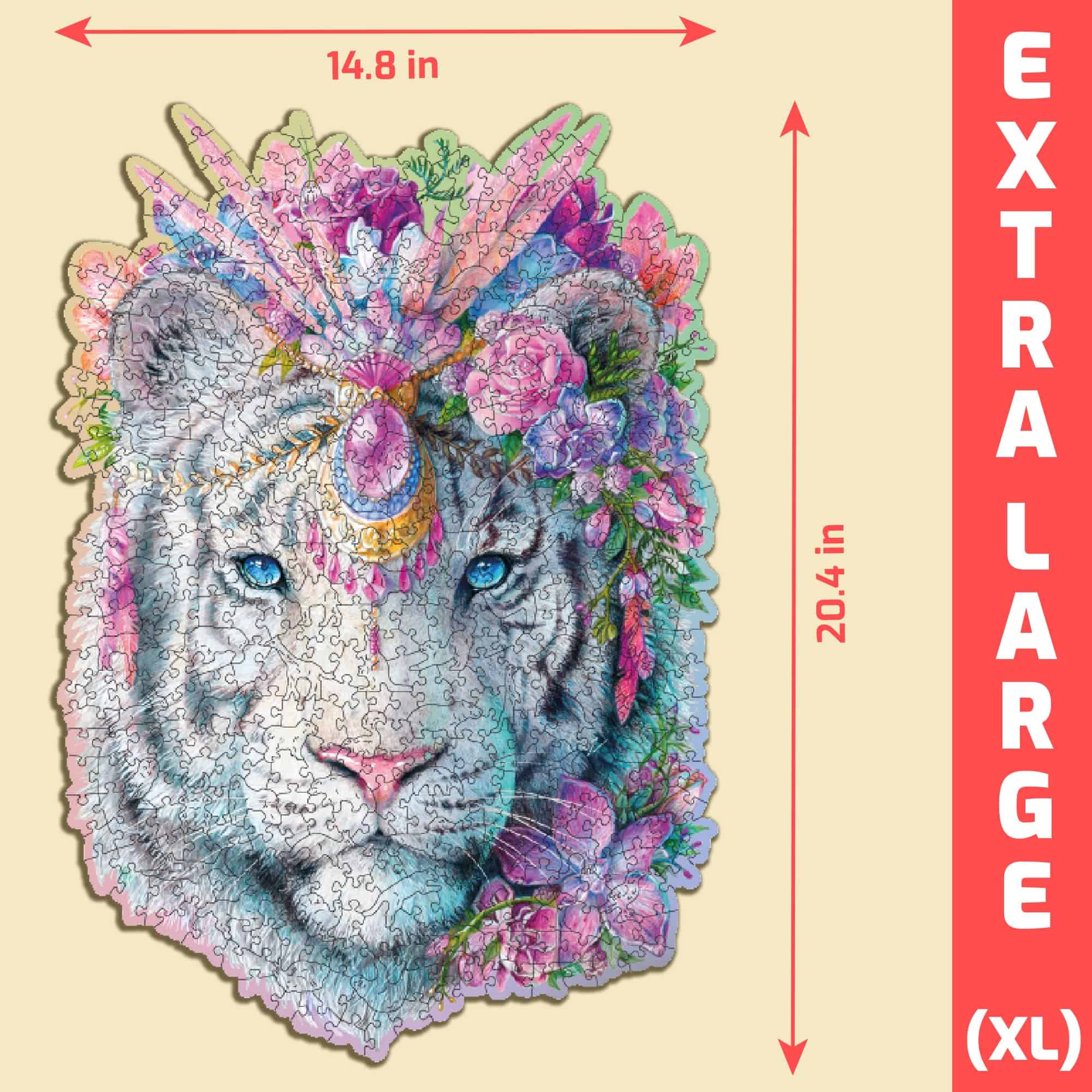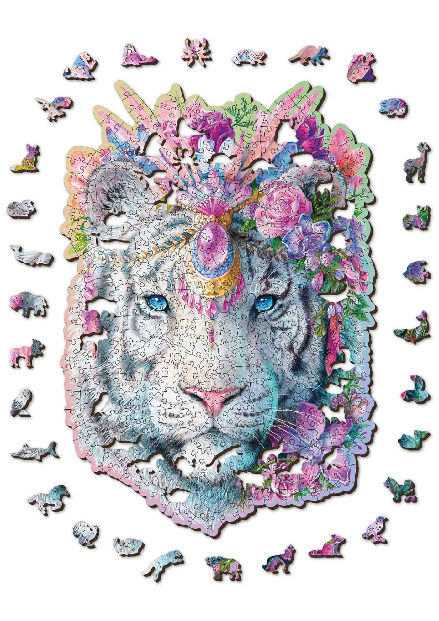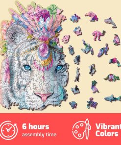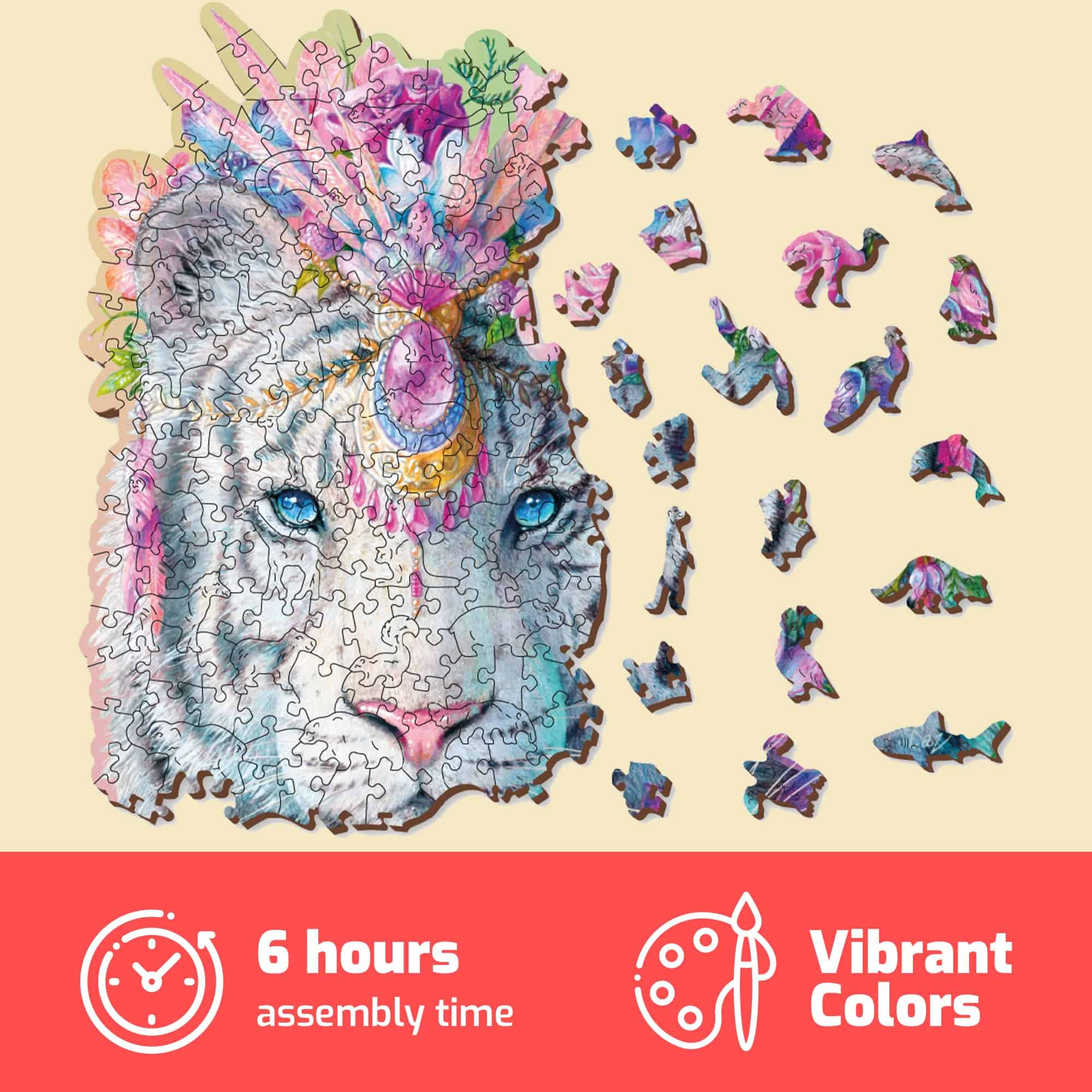 1. ¡DISFRUTA DE UNA AVENTURA SALVAJE – Forma un mágico tigre blanco con el rompecabezas del rey tigre. Cada rompecabezas único está compuesto por 505 piezas, algunas de las cuales son puzzles con formas de animales. La forma del rompecabezas es la cabeza de un tigre.