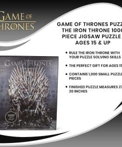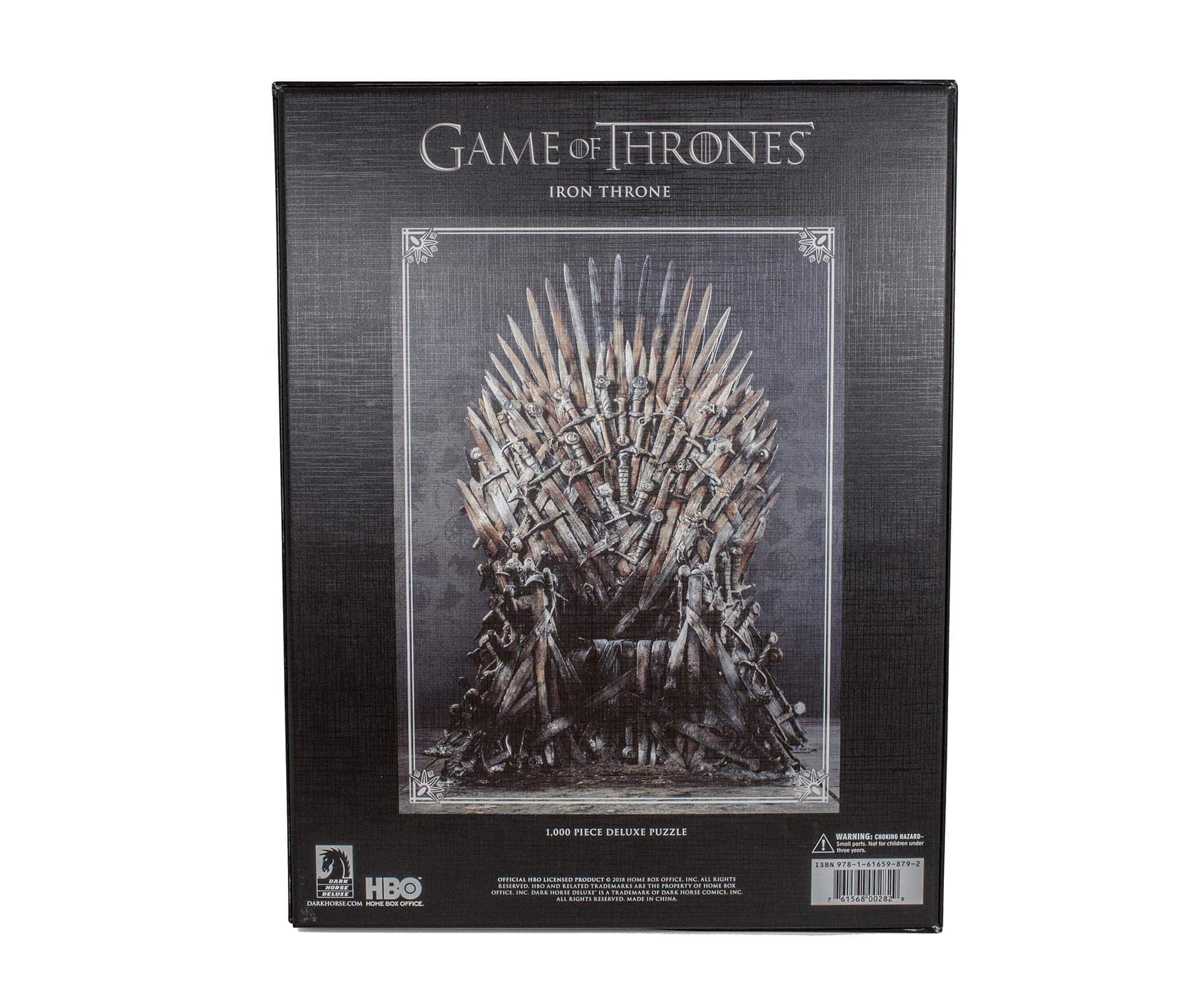 Las imágenes más icónicas de Game of Thrones de HBO incluyen el indomable Trono de Hierro. El Trono de Hierro se muestra aquí en un rompecabezas deluxe de 1,000 piezas. Una vez completado, el rompecabezas mide 20″ x 27″ y está impreso en un acabado mate de alta calidad. Las piezas del rompecabezas están aseguradas dentro de una bolsa y empaquetadas en una caja a todo color.