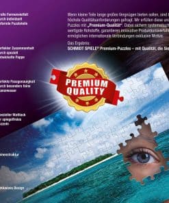 Si las piezas pequeñas van a ofrecer un gran placer durante mucho tiempo, se requieren los más altos estándares de calidad en su producción. Cumplimos con estos requisitos y llamamos a nuestros rompecabezas «calidad premium». Los controles sistemáticos garantizan los materiales primos de la más alta calidad, procesos de producción innovadores, el mejor diseño, permiten conexiones internacionales y motivos exclusivos. El resultado: rompecabezas premium de Schmidt Spiele, con calidad que puedes sentir. Cohesión perfecta gracias al cartón especialmente desarrollado. Ajuste perfecto gracias a cuchillas de troquelado especialmente finas. Gran variedad de formas gracias a piezas de rompecabezas individualmente formadas. Textura de lino. Barniz mate especial para un armado sin reflejos. Diseño exclusivo.