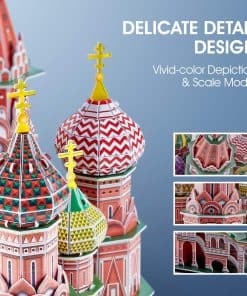El rompecabezas en 3D de CubicFun es un juguete educativo y ecológico que ayudará a mejorar la concentración y la creatividad de los niños. Nuestro producto es de alta calidad en material y estándares. Los niños pueden disfrutar explorando su curiosidad e imaginación mientras entrenan su pensamiento lógico y habilidades motoras y de resolución de problemas. Brindamos instrucciones paso a paso fáciles de seguir. Nuestros Rompecabezas en 3D no solo se limitan a los niños, sino que también son ideales para familias de todas las edades. Las piezas de rompecabezas de papel precortadas y de espuma están fabricadas con precisión para encajar perfectamente juntas y no se requiere pegamento ni herramientas. ¡Crea tu propia réplica en 3D realista de una famosa pieza de arquitectura con este rompecabezas de la Catedral de San Basilio! Rompecabezas para Familias: Dedica tiempo a jugar en familiaRelaja la mente y alejate de la rutina diariaExplora la belleza de la gran arquitectura del mundoJuguetes Educativos de Construcción: Mejora la concentración, la creatividad, explora la curiosidad y la imaginación, y entrena el pensamiento lógico, las habilidades motoras y de resolución de problemasRegalos y Recuerdos Búsqueda de diseños para decorar su casa, o qué comprar como recuerdos para su socio comercial Qué hay en la caja Rompecabezas en 3D de montaje fácil con materiales duraderos, fácil de ensamblar Instrucciones de montaje coloridas con fotos llamativas Perforadora Pasos de montaje: 1. Sigue las instrucciones. Cada pieza de rompecabezas está numerada para ayudarte a ensamblar. 2. Se RECOMIENDA perforar todos los agujeros de interconexión antes del montaje. 3. Para asegurarte de que cada pieza pueda ser claramente identificada, NO desmontes todas las piezas a la vez, por favor solo desmonta las piezas que necesitas para cada paso durante el montaje. Consejos: – Ensámblalo con paciencia y cuidado, NO fuerces a que se unan dos piezas/componentes. – Cada pieza de rompecabezas tiene dos lados, y se pueden doblar en una sola dirección, asegúrate de que el lado correcto de las piezas esté hacia afuera.