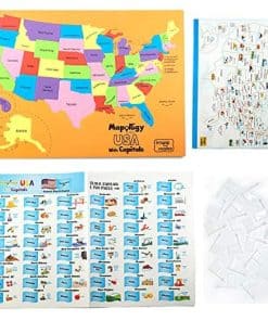 ¿Puedes adivinar cuál estado es conocido por el jarabe de arce? ¿O dónde se encuentra el Puente Golden Gate o el Monte Rushmore? ¿Cuál es la capital de Rhode Island o quién es el vecino de Texas? Ayuda a tus hijos a aprender esto y mucho más mientras juegan con el rompecabezas del mapa de EE. UU. de 1.5 pies (43 cm) x 1 pie (33 cm) de Imagimake. El rompecabezas principal está hecho de espuma EVA de 8 mm de espesor con piezas de rompecabezas con forma de estados que encajan perfectamente. El rompecabezas cubre los 50 estados del país a través de 46 piezas de rompecabezas (algunos de los estados más pequeños se han agrupado para que los pequeños dedos puedan maniobrarlos más fácilmente). La impresión del mapa también marca los océanos, el Golfo de México y los Grandes Lagos. Una vez que los niños hayan resuelto el rompecabezas para aprender los estados, pueden pasar a las banderas y pegatinas. El paquete de juguetes viene con una hoja de pegatinas que tiene las capitales y el dato divertido de cada estado alineados para facilitar el aprendizaje. Estas pegatinas deben pegarse en cada uno de los 50 estados y 1 capital del país. Cada estado tiene una ranura provista para colocar la bandera de plástico. Las instrucciones guían a los niños para colocar las banderas en los estados con precisión. El mapa está hecho de una base de espuma de 8 mm que hace que el producto sea duradero y más fácil de manejar. Las piezas de colores vibrantes son muy emocionantes para un niño jugar con ellas. Uno de los mejores juguetes de aprendizaje divertidos que trabaja en habilidades motoras, habilidades espaciales y satisface el desarrollo de habilidades de aprendizaje infantil. El rompecabezas también es muy popular como regalo para cumpleaños, Navidad y Pascua para niños en el rango de 5 a 8 años. ¡Únete a nosotros en esta divertida expedición de geografía!