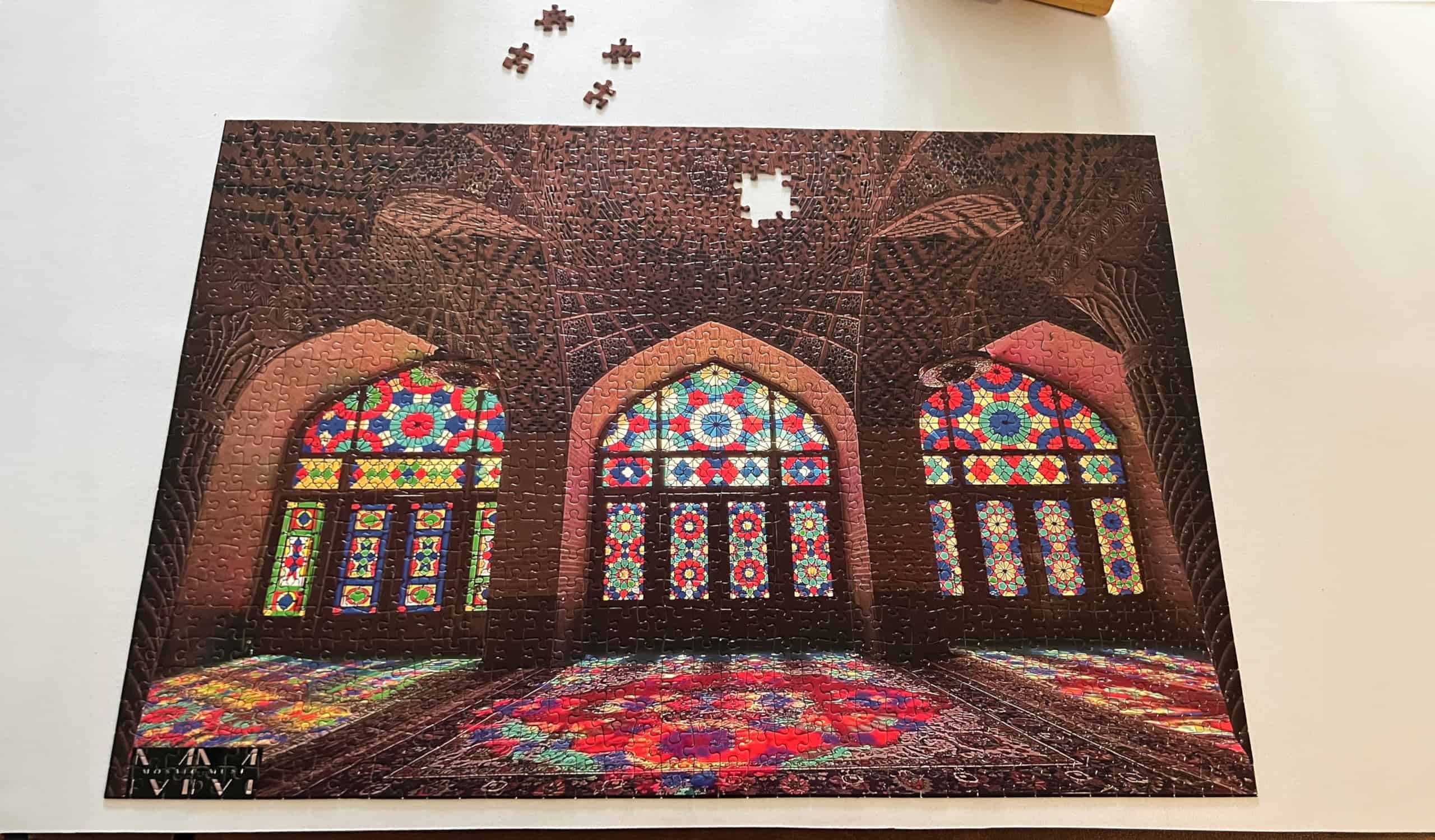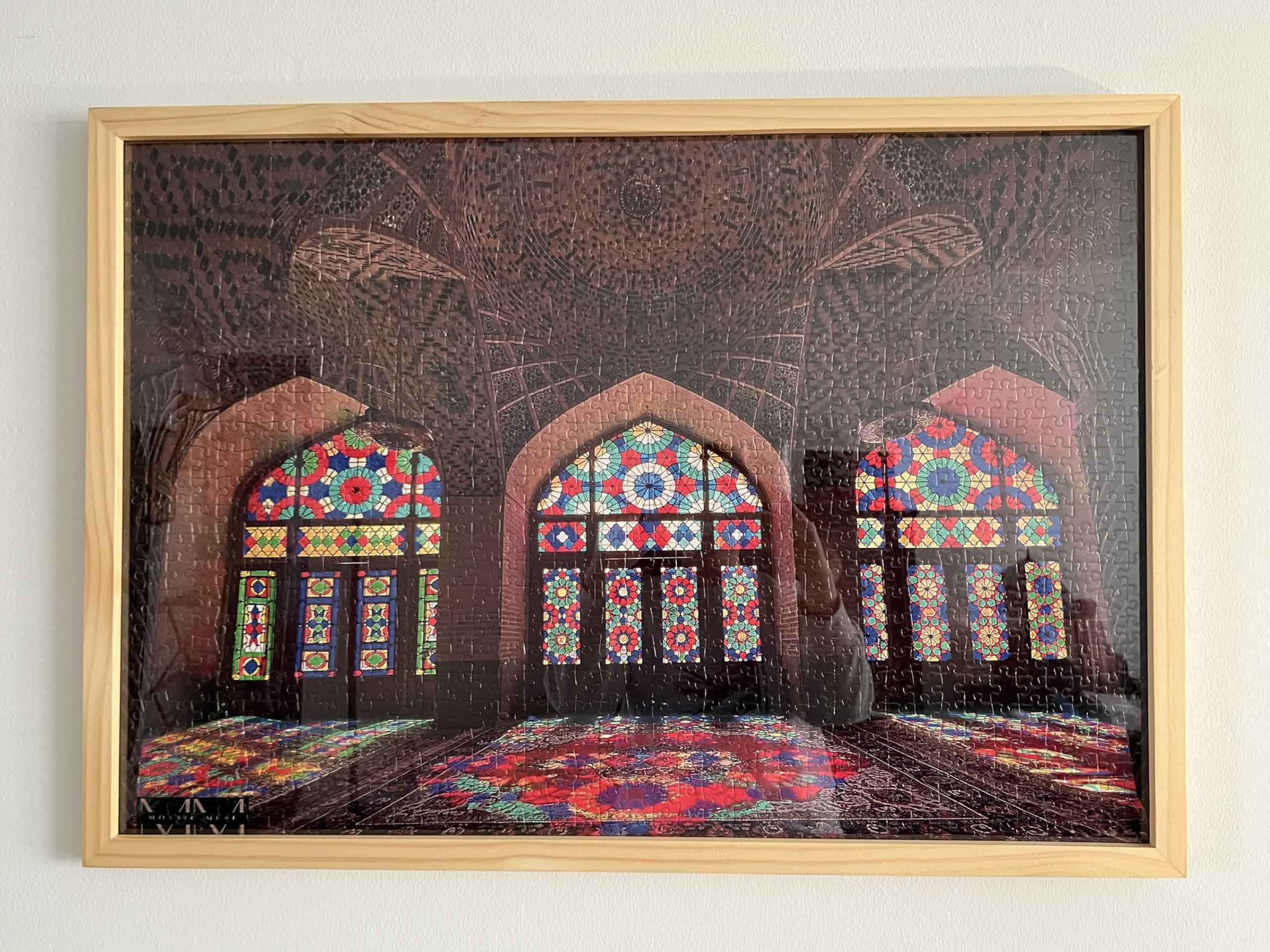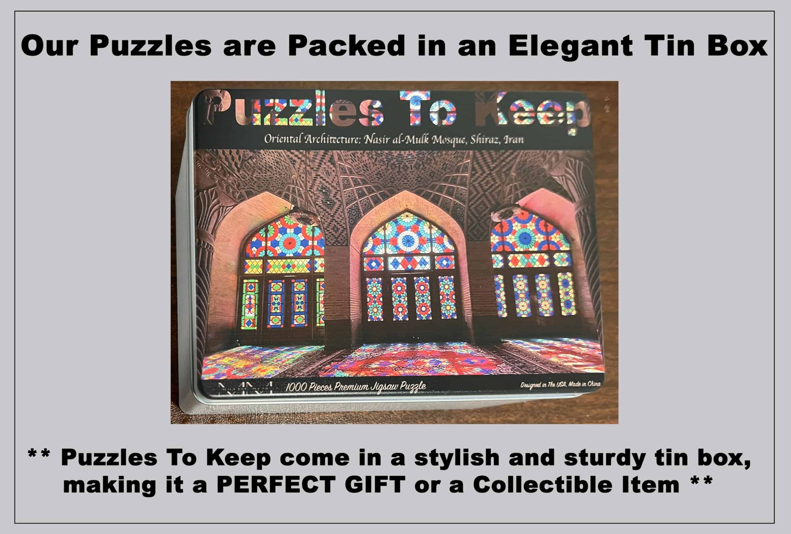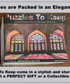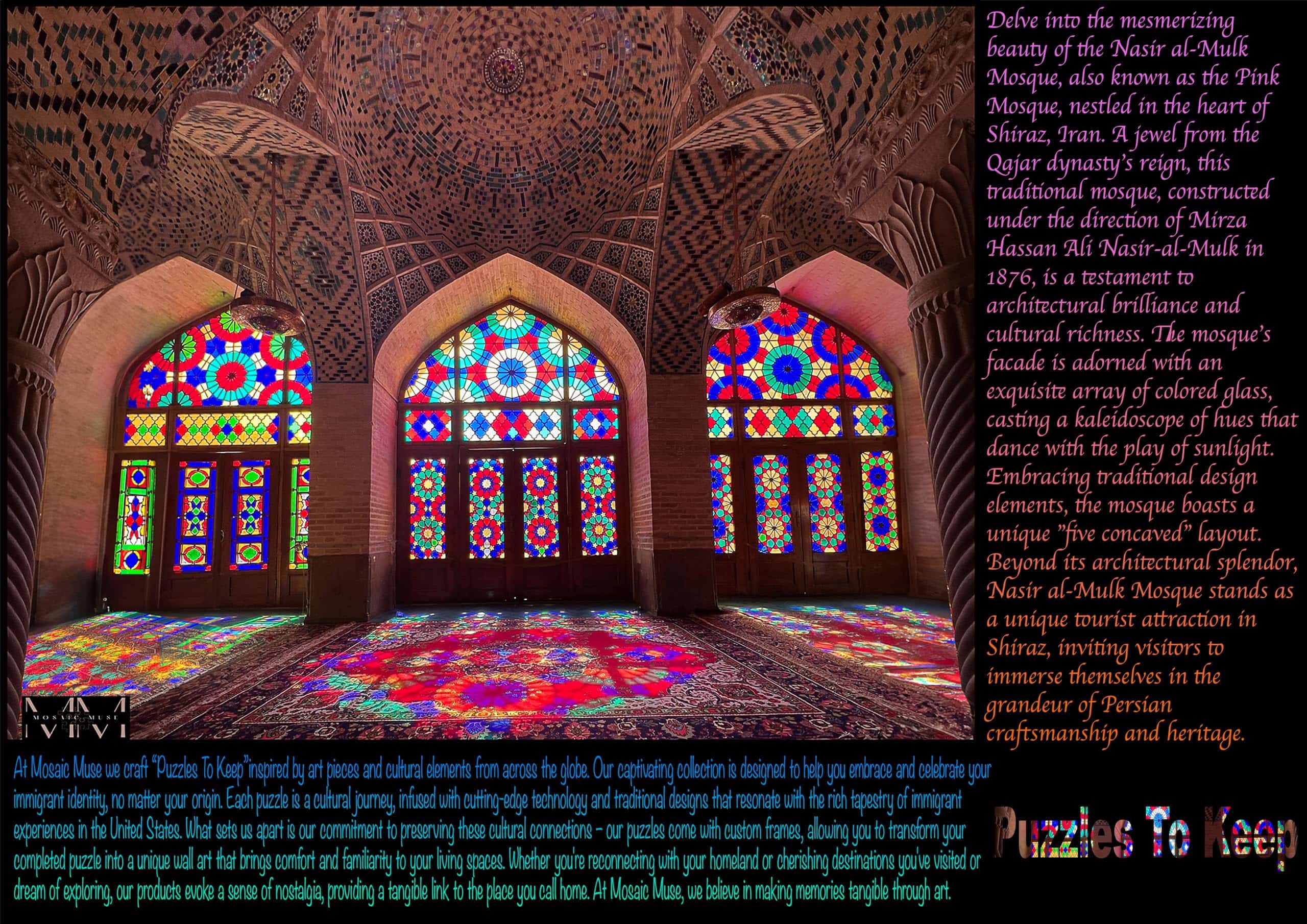 Rompecabezas Para Mantener – Arquitectura Oriental 1000 piezas Rompecabezas Premium, Magnífica Arquitectura Iraní en la Mezquita Nasir-al-Mulk en Shiraz, Irán – Viene en Caja de Lata Adéntrate en la belleza fascinante de la Mezquita Nasir al-Mulk, también conocida como la Mezquita Rosa, situada en el corazón de Shiraz, Irán. Una joya de la época de la dinastía Qajar, esta mezquita tradicional, construida en 1876, es un testamento de la brillantez arquitectónica y la riqueza cultural. La fachada de la mezquita está adornada con una exquisita variedad de vidrios de colores, proyectando un caleidoscopio de tonos que bailan con el juego de la luz. Adoptando elementos de diseño tradicionales, la mezquita presume de un diseño único de «cinco cóncavos». Más allá de su esplendor arquitectónico, la Mezquita Nasir al-Mulk se erige como una atracción turística única en Shiraz, invitando a los visitantes a sumergirse en la grandeza de la artesanía y la herencia persas.