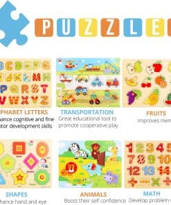 2. HERRAMIENTAS EDUCATIVAS IDEALES: Nuestros rompecabezas de madera para niños pequeños no son solo juegos simples, son juguetes educativos diseñados para ayudarles a aprender sobre animales, letras, números, signos matemáticos, formas, vehículos y frutas. Nuestro set de rompecabezas de madera con perillas es una herramienta fantástica para afilar habilidades cognitivas, motoras y de reconocimiento de patrones; Estos rompecabezas educativos para niños también pueden mejorar la coordinación mano-ojo y las habilidades de percepción visual al proporcionar actividades de emparejar formas para niños y niñas.