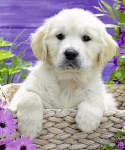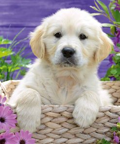 1. En este rompecabezas, vemos a un cachorro de golden retriever acurrucado en una cesta de mimbre y rodeado de flores moradas que parece súper tierno y divertido. ¡Un gran juguete para perros! Pero obviamente no para perros.