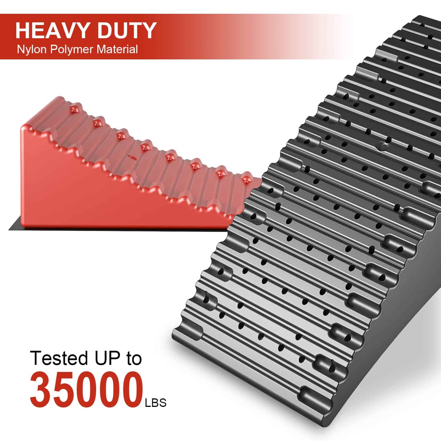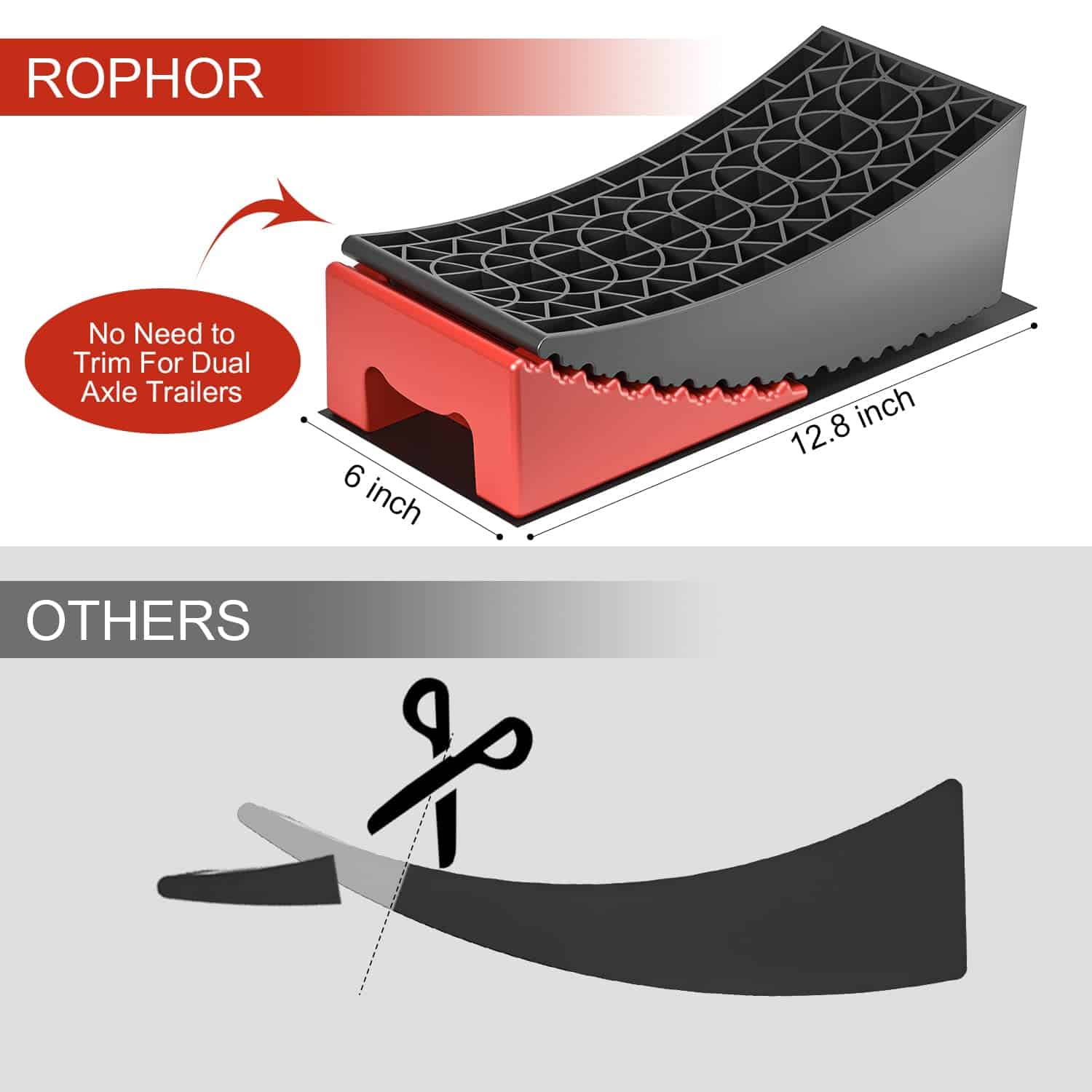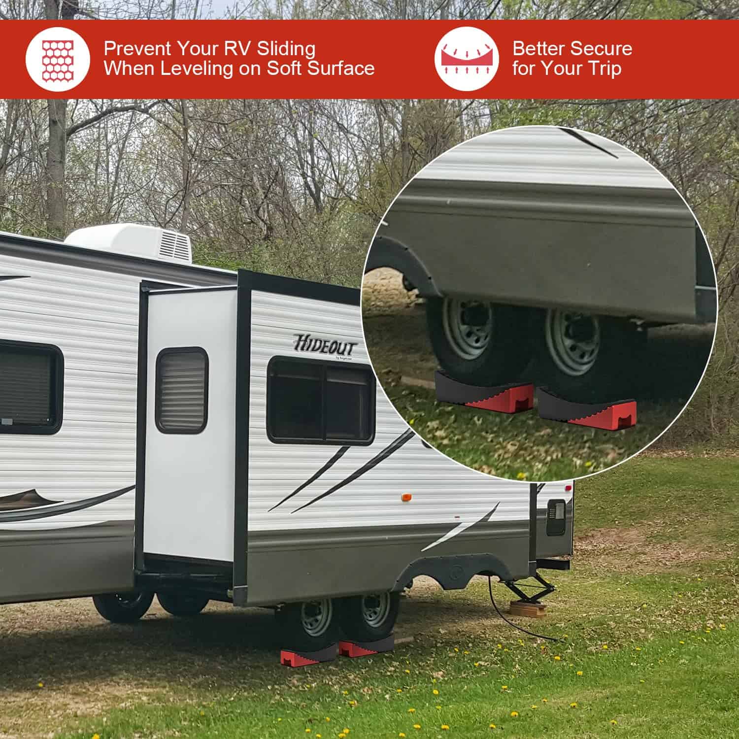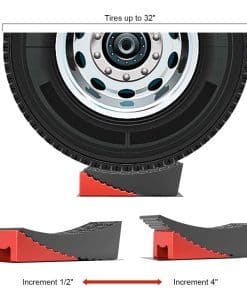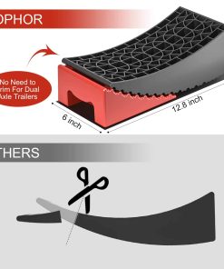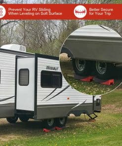 2. Construcción Resistente: Construidos con un polímero de alto rendimiento, los Niveladores de Remolque Rophor están hechos para durar mucho tiempo. Nuestros Niveladores de Remolque funcionan con cualquier remolque que pese hasta 35,000 libras y con neumáticos de hasta 32″ de diámetro, no se rompen ni comprimen bajo el peso del remolque como lo hacen otros niveladores de RV que están hechos de HDPE o PP. Esto es una seguridad muy importante.