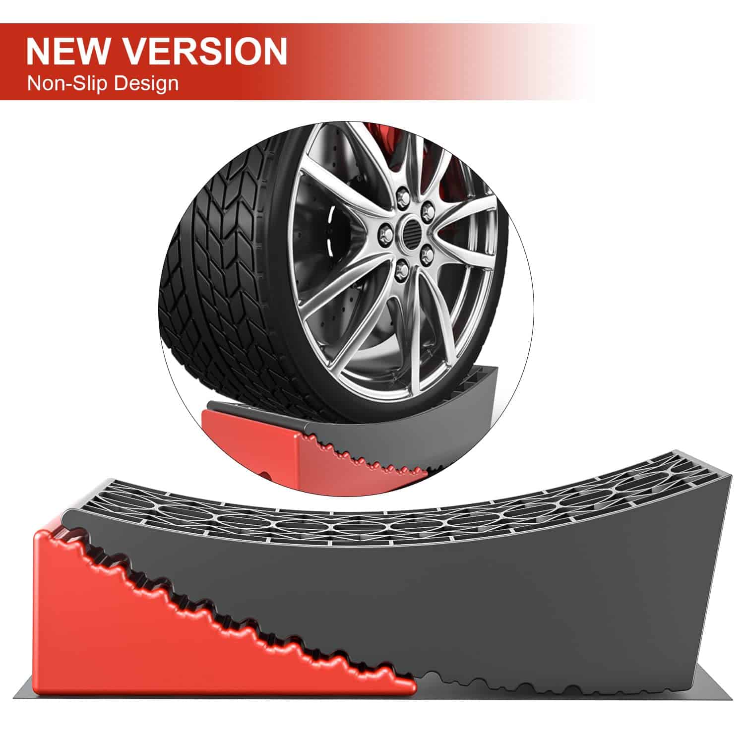 1. Diseño Doblemente Antideslizante: Nueva versión desarrolló un diseño especial antideslizante con canales de agarre precisos en la superficie de los niveladores para evitar que se deslicen al respaldar la llanta del remolque sobre los niveladores. Además, agregamos dos almohadillas antideslizantes para garantizar aún más que el sistema de nivelador no se deslice.