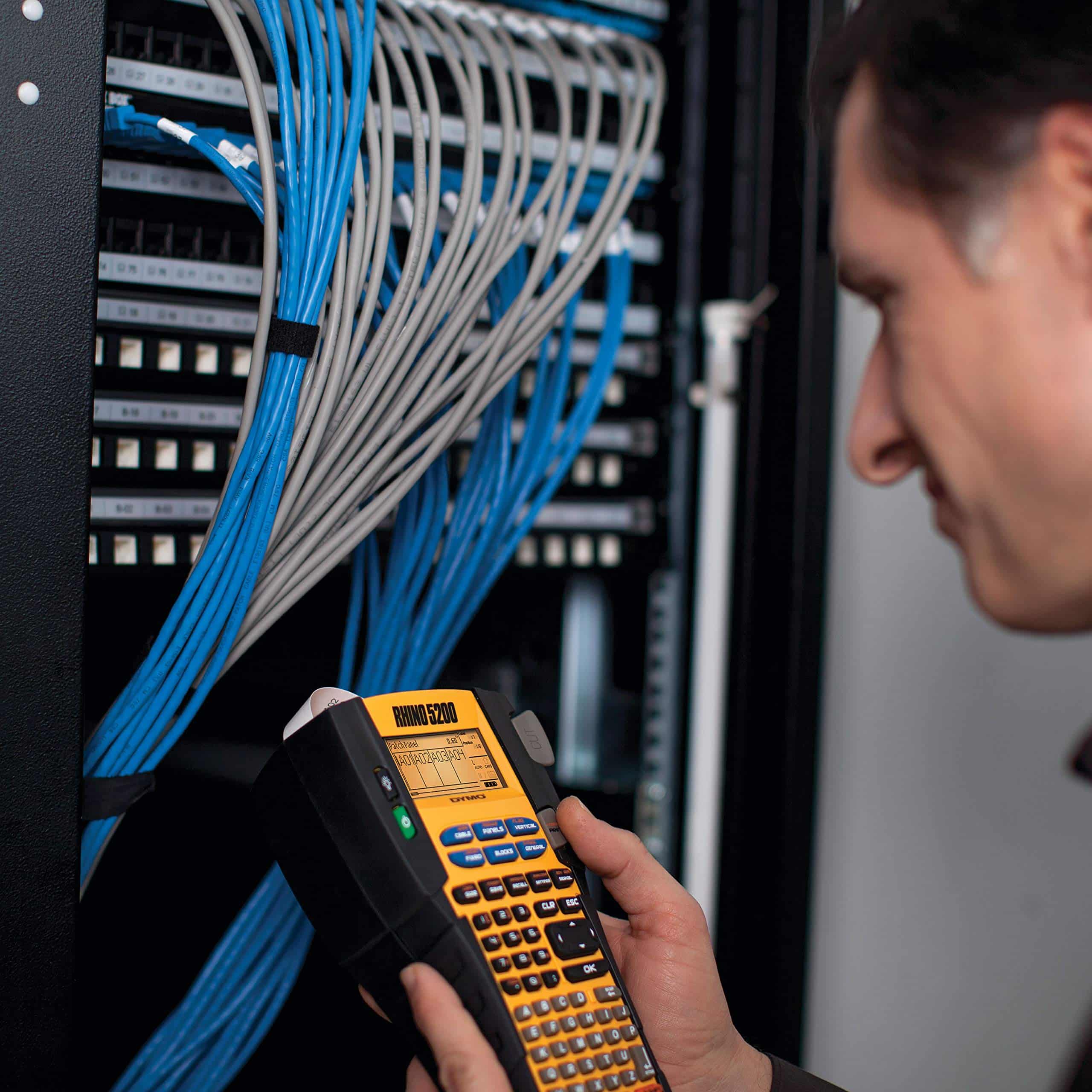 Robusta, versátil y repleta de funciones que ahorran tiempo, la Rotuladora Industrial DYMO Rhino 5200 cumple con los principales estándares de etiquetado ANSI y TIA/EIA 606-A, y etiqueta hasta un 77% más rápido que la competencia . Simplemente presiona una tecla de acceso directo Rhino exclusiva para cambiar automáticamente el tamaño, espacio y formato del texto para etiquetas perfectas de paneles de conexiones – luego presiona otra para imprimir identificadores de cables o pestañas de placas frontales, sin necesidad de volver a escribir. Es igual de fácil imprimir etiquetas de módulos y de longitud fija, envolturas de alambre horizontales y verticales, bloques de terminales y 110, y mucho más. Imprime códigos de barras Code 39 y Code 128. Accede a más de 100 símbolos de la industria, fracciones y signos de puntuación con solo unos cuantos golpes rápidos de tecla. Agrega la batería de iones de litio de carga rápida opcional para una productividad ininterrumpida. Este bundle de ahorros incluye un resistente maletín de transporte y 2 rollos de etiquetas de vinilo (3/4″ y 3/8″, Negro sobre Blanco). Basado en pruebas independientes de Rhino 5200 vs. Panduit PanTher LS8, Brady, BMP21, Brother PT1650 medido en número de pulsaciones de teclas al hacer etiquetas para paneles de conexiones y todas las etiquetas asociadas de cables y placas frontales