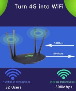 Router 4G WiFi CAT4, proporciona una velocidad de transmisión inalámbrica de hasta 300Mbps. Produce un hotspot WiFi de 2.4GHz con una potente cobertura de WiFi de 3,000 metros cuadrados. Comparte la conexión a internet con hasta 32 usuarios de WiFi.