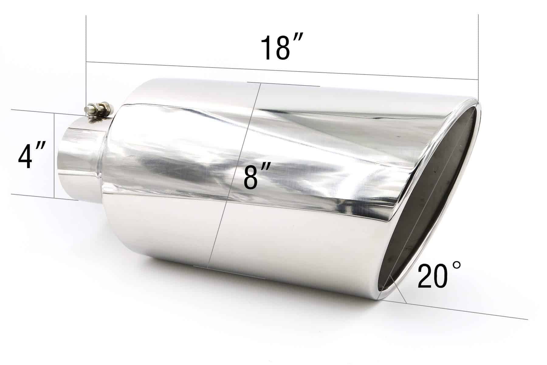 Especificación: Diámetro de entrada: 4 pulgadas, diámetro de salida: 8 pulgadas, longitud total: 18 pulgadas, estilo: Corte angular individual de 20 grados con borde enrollado; Perno en estilo, material: Acero inoxidable de alta calidad.