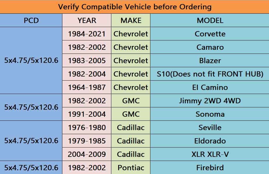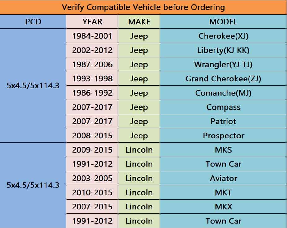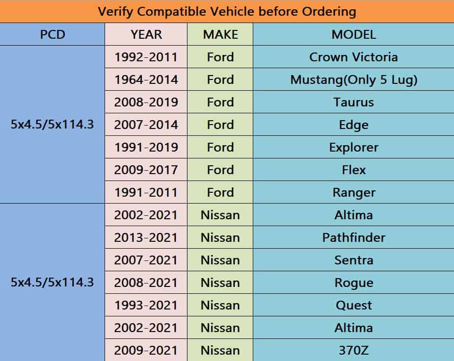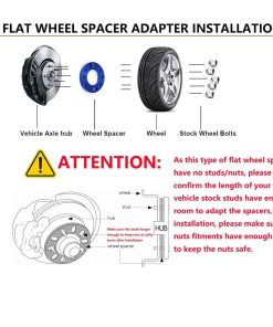 Especificaciones: Estos separadores NO SON ADAPTADORES, solo ensanchan las ruedas, no cambian el patrón de pernos. Paquete de 4 Separadores de Rueda. Grosor: 1/2″ o 12mm | Patrón de Perno del Vehículo: 5×4.5″ 5×4.75″ 5×114.3 5×120.65 | Patrón de Perno de la Rueda: 5×4.5″ 5×4.75″ 5×114.3 5×120.65| Diámetro del Cubo Central: 78.1mm. Acabado Anodizado Azul. Comprueba la compatibilidad de vehículos recomendada debajo, no arriesgue su vehículo inapropiado. Si no está seguro de si este artículo se ajusta a usted, envíenos un mensaje con el año, fabricante y modelo de su vehículo, encontraremos el artículo que necesita. 1984-2001 Cherokee (XJ) 2002-2012 Liberty (KJ KK) 1987-2006 Wrangler (YJ TJ) 1993-1998 Grand Cherokee (ZJ) 1986-1992 Comanche (MJ) 2007-2017 Compass Patriot 2008-2015 Prospector 1964-2014 Mustang (Solo 5 Lug) 1991-2010 Explorer 1991-2011 Ranger 1992-2011 Crown Victoria 2007-2010 Edge 2008-2019 Taurus 2009-2017 Flex 1995-2021 Avalon 1992-2021 Camry 2002-2021 Highlander 2005-2015 Tacoma (Solo 5 Lug) 1995-2021 RAV-4 1998-2021 Sienna 2009-2016 Venza 1998-2021 Accord (Solo 5 Lug) 2006-2021 Civic 1997-2021 CRV 2011-2017 CRZ 2003-2011 Element 1994-2004 Odyssey 1993-2021 Pathfinder 2008-2021 Rogue 1993-2021 Quest 2003-2021 Murano 2007-2021 Sentra 2002-2021 Altima 2009-2021 370Z. NOTAS IMPORTANTES: Se recomienda la instalación profesional. Es necesario realizar una alineación después de la instalación, esto evitará que ocurran sacudidas y vibraciones. Verifique que el recuento de pernos, el diámetro del círculo de pernos, el diámetro del centro y el tamaño de los pernos coincidan con su vehículo antes de hacer el pedido.