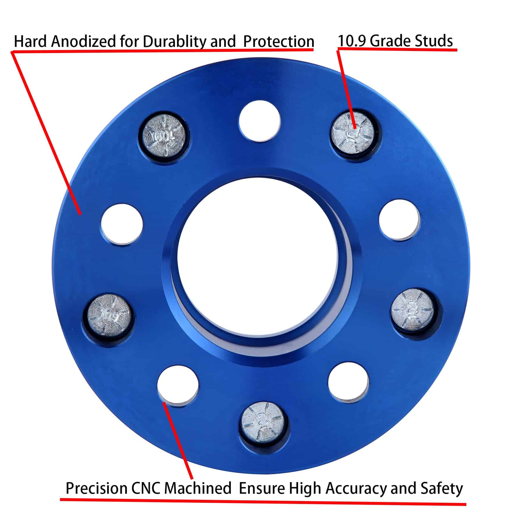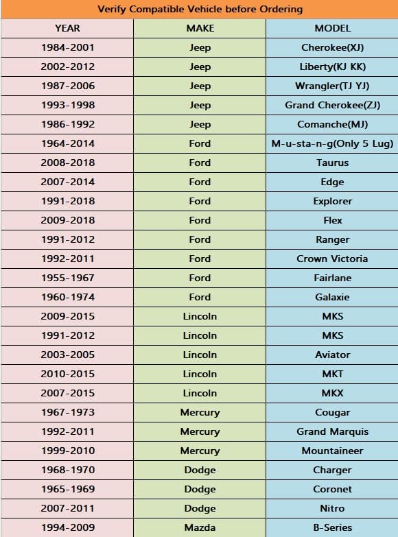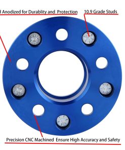 Especificación: Patrón de perno del vehículo 5X4.5, patrón de perno de la rueda 5X4.75 PCD, paso de rosca SAE 1/2-20, buje de 73mm, 4pcs 1.5″ de grosor. Los Adaptadores de Rueda RSOXTECH ensancharán la base de ruedas de tu carro, mejorando el agarre, manejo y precisión. Desarrollados en una aleación de aluminio especial mediante una tecnología de forjado innovadora, posteriormente se maquinan con CNC para obtener la superficie coplanar perfecta. Están tratados térmicamente para aumentar la resistencia mecánica y luego se anodizan para obtener la protección contra la oxidación. Verifica la Compatibilidad/Ajuste del vehículo recomendada a continuación, no arriesgues con un vehículo inapropiado. Vehículos Compatibles: Cherokee 1984-2001 (XJ), Liberty 2002-2012 (KJ KK), Wrangler 1987-2006 (TJ YJ), Gran Cherokee 1993-1998 (ZJ), Comanche 1986-1992 (MJ), Ford Mustang 1994-2014 (Solo 5 pernos), Taurus 2008-2018, Edge 2008-2021, Explorer 1991-2019, Flex 2009-2017, Ranger 1991-2011, Lincoln MKS 2009-2016, Town Car 1991-2012, Mercury Cougar 1967-1973, Grand Marquis 1992-2011, Mountaineer 1999-2010. NOTAS IMPORTANTES: Se recomienda instalación profesional. Es necesario realizar alineación después de la instalación, esto evitará que ocurran vibraciones y movimientos inadecuados. Evita una llave de impacto; el uso incorrecto puede causar que los pernos/tuercas se rompan o se desprendan mientras conduces, lo que podría llevar a un accidente o lesión potencial. Asegúrate de dar 6-8 vueltas antes de apretar. Vuelve a ajustar todos los pernos/tuercas después de 25-50 millas de conducción, luego nuevamente luego de 1-2,000 millas. La parte posterior del adaptador debe estar enrasada contra el cubo del vehículo. Sin óxido en el interior del cubo y de la rueda al instalar los separadores de rueda centrados en el cubo. Si los pernos sobrepasan la cara del adaptador, deberás cortarlos/molerlos más cortos.