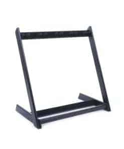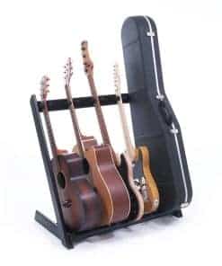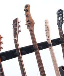 Este soporte premium de guitarra de 5 vías y estuche fue diseñado para permitirte mostrar tus hermosas guitarras y estuches en tu hogar o estudio, y hacerlo con estilo. La ventaja única de este soporte de guitarra es que puedes personalizarlo en cuestión de segundos. Puedes sostener 5 soportes para guitarra, 5 estuches para guitarra o una mezcla de ambos, dependiendo totalmente de tu colección personal y de lo que te gustaría exhibir. Con una estructura de madera de caoba negra maciza, este bastidor de guitarra y estuche de guitarra llega empaquetado plano y se puede montar en poco tiempo usando nuestra simple «Guía de 4 Pasos» proporcionada en la caja, para que puedas presentar tus guitarras con estilo en minutos después de la entrega. Este soporte servirá para guitarras acústicas de tamaño completo, guitarras eléctricas y guitarras bajo.