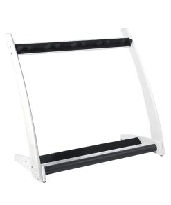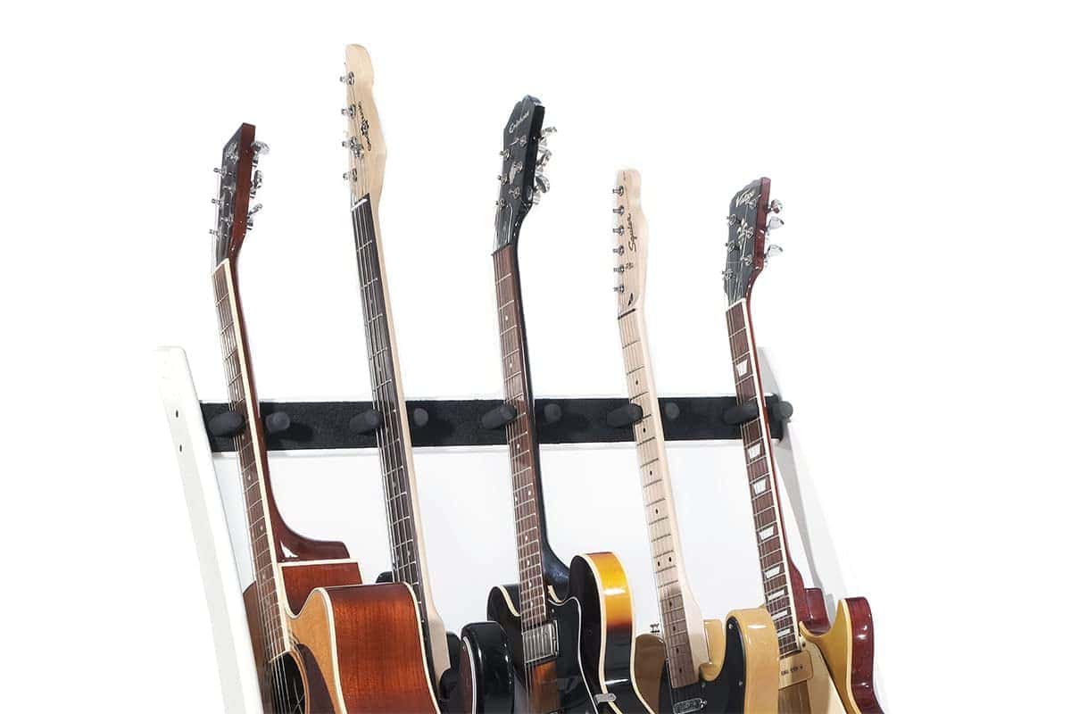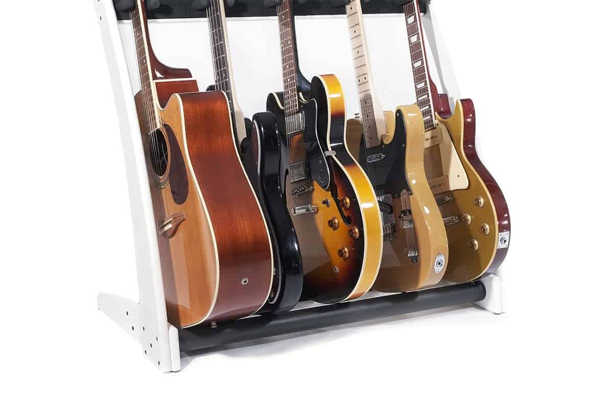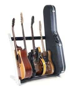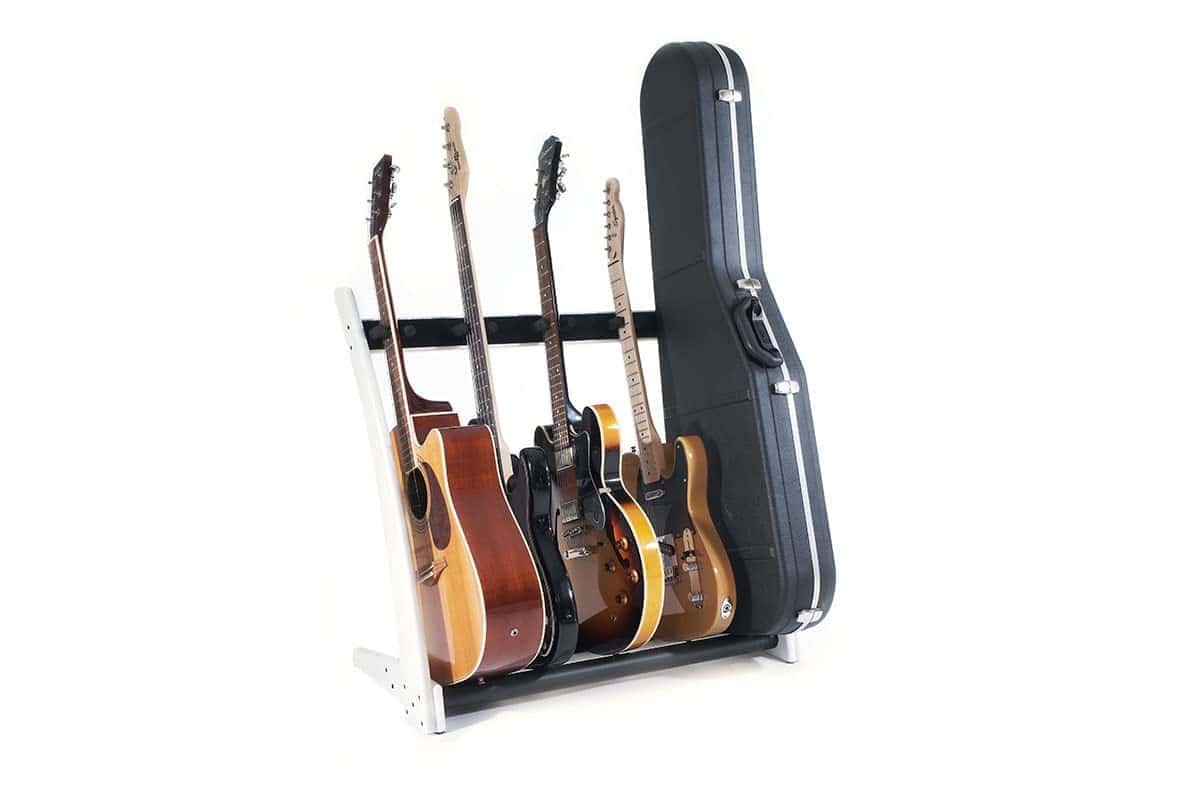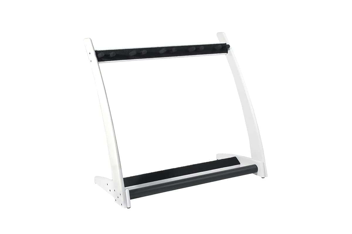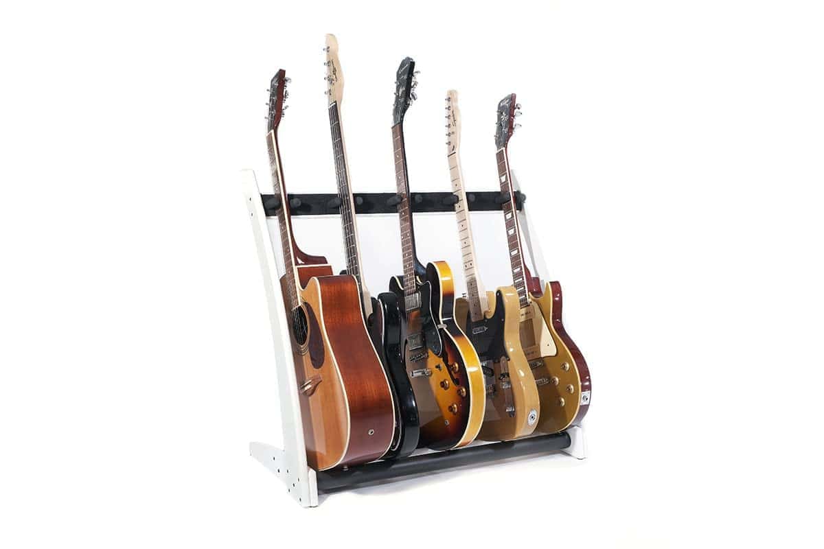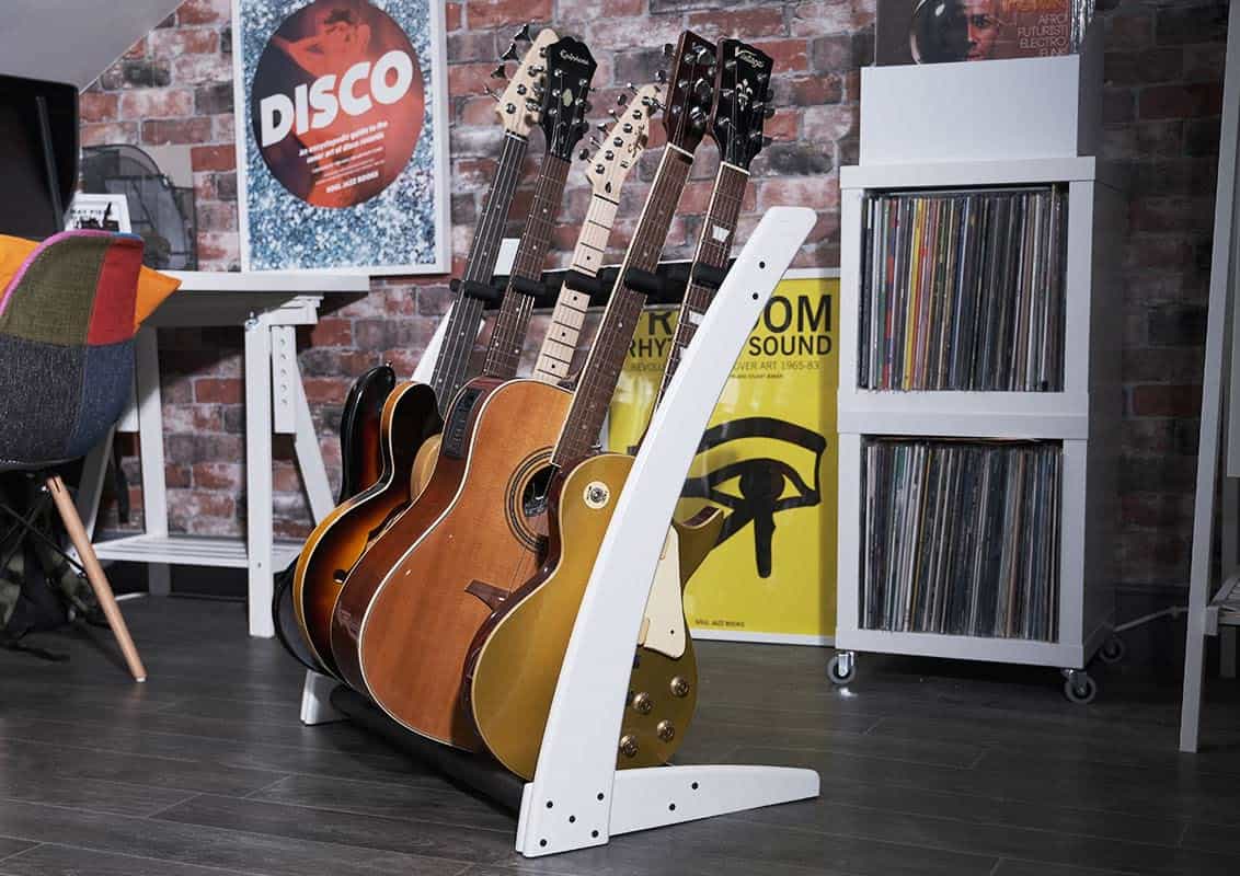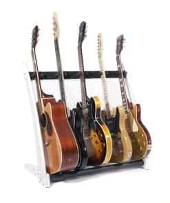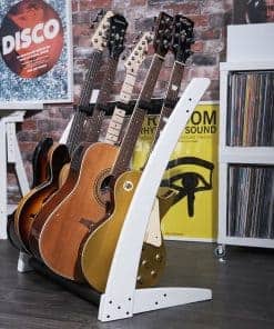 Este soporte premium de madera maciza para 5 guitarras y estuches fue diseñado para que puedas mostrar tus hermosas guitarras y estuches en tu hogar o estudio con estilo. Derivado de nuestro popular modelo GR2, el GR2C toma un enfoque más curvo en la estética. La ventaja única de este soporte de guitarra es que puedes personalizarlo en segundos. Puedes sostener 5 soportes para guitarra, 5 estuches para guitarra o una combinación de ambos, dependiendo completamente de tu colección personal y lo que te gustaría mostrar. Con una estructura de madera de caoba sólida, este soporte de guitarra y estuche de guitarra llega en embalaje plano y se puede ensamblar en poco tiempo utilizando nuestra sencilla «Guía de 4 Pasos» proporcionada en la caja, para que puedas presentar tus guitarras con estilo en cuestión de minutos después de la entrega. Este soporte se adapta a guitarras acústicas, eléctricas y bajos de tamaño completo.