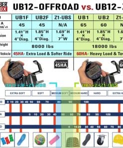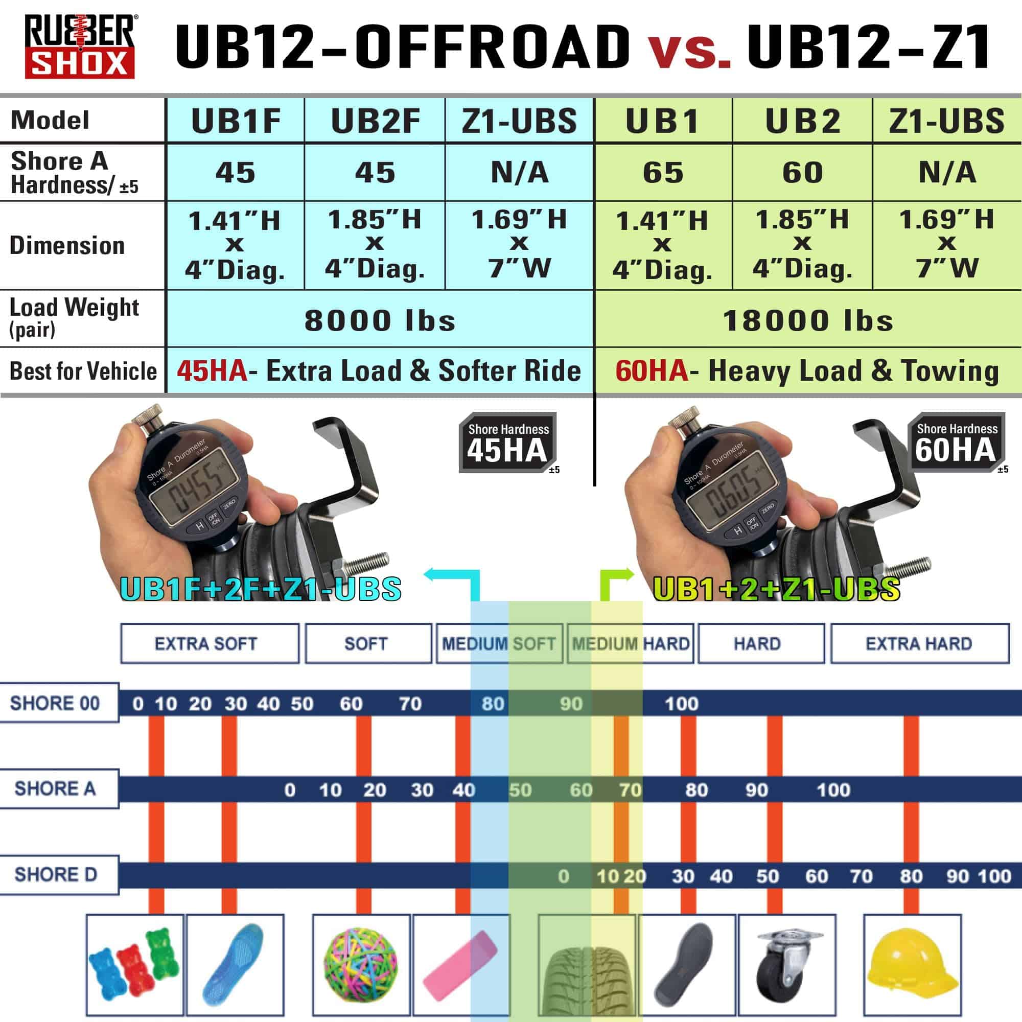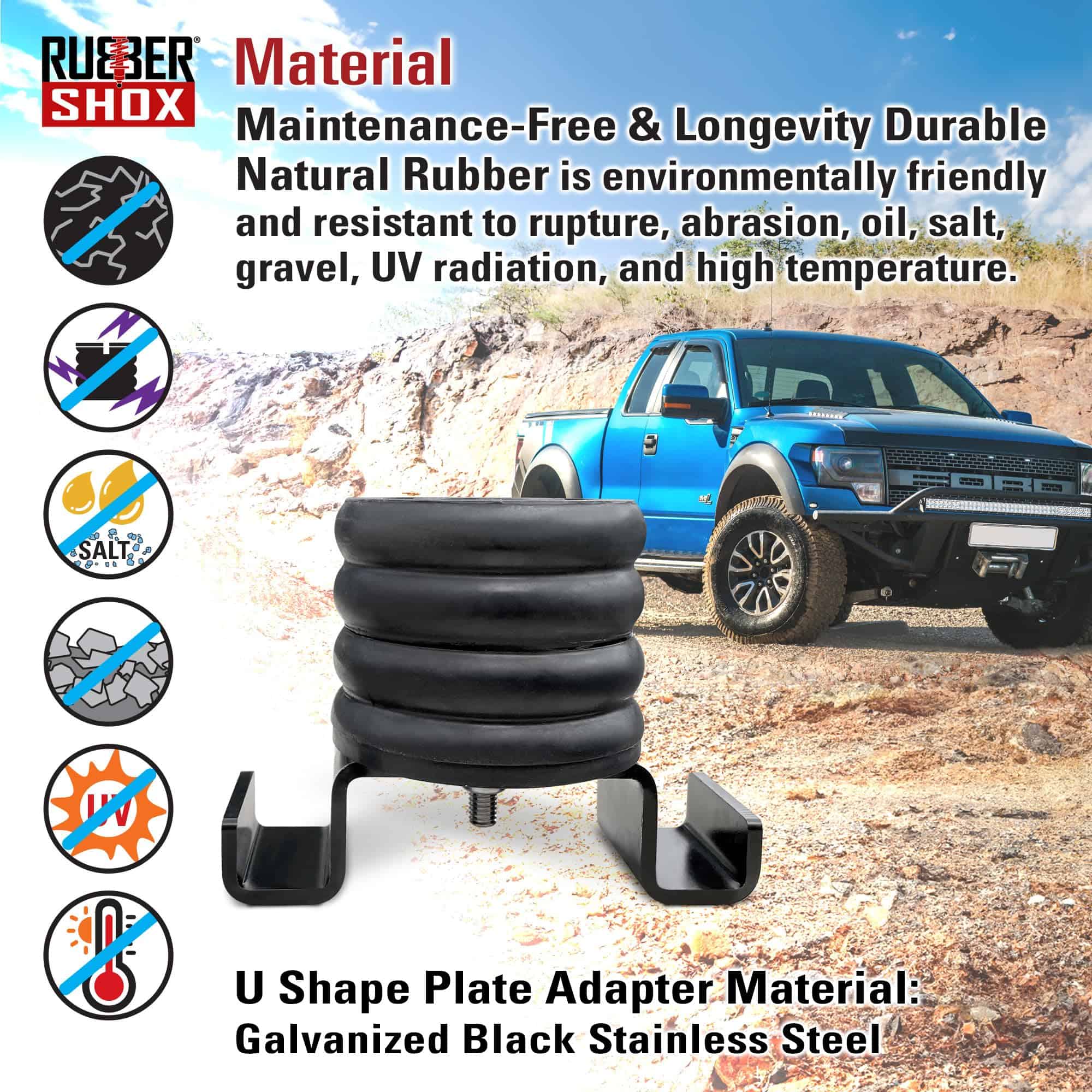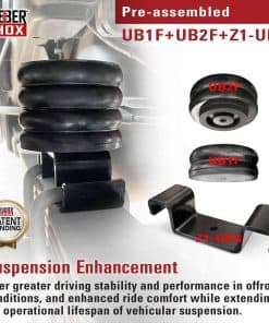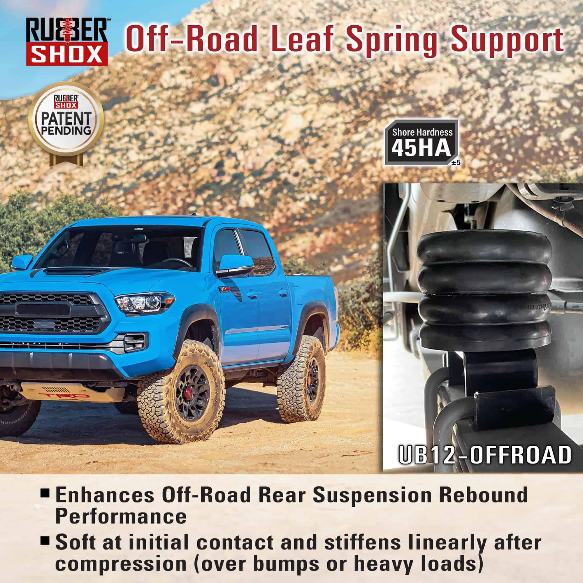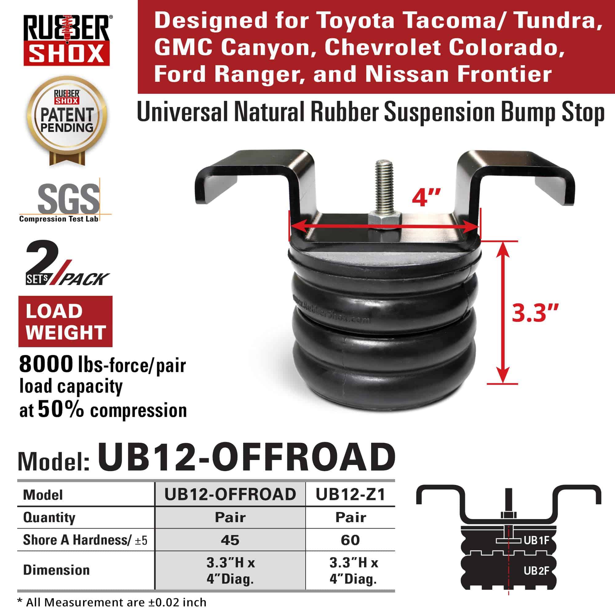 Topes de Goma Natural Rubbershox para Suspensión Off Road Delanteros y Traseros están diseñados para mejorar la suspensión de vehículos como Toyota Tacoma, Toyota Tundra, Chevrolet Colorado, Nissan Frontier, Ford Ranger, GMC Canyon. Con un tamaño de producto de UB12-OFFROAD: 3.3″X4″D y una capacidad de carga de 9000 lbs/par de capacidad de carga a 50% de compresión, estos topes de goma brindan un soporte adicional a la suspensión vehicular. El paquete incluye UB1F, UB2F, Z1-UBS, Perno de Tornillo de Acero Inoxidable de 10 mm Rosca Completa de 90/60/45/30 mm, Arandela de Acero Inoxidable, Tuerca Loca de Nylon de Acero Inoxidable, Tuerca MS y manual de instalación. Los topes de goma duraderos están hechos de goma natural sostenible y resistente a la ruptura, abrasión, aceite, sal, grava, radiación UV y alta temperatura. Puede combinar el Módulo Superior UB1A con el Sub-Módulo UB2 y/o UB3/UB3A para ajustar la altura de suspensión. La dureza de 45 Shore A garantiza un contacto suave al principio y un aumento en la rigidez al comprimirse, brindando una experiencia de conducción mejorada. ¡Obtenga los Topes de Goma Natural Rubbershox para mejorar la suspensión de su vehículo ahora mismo!