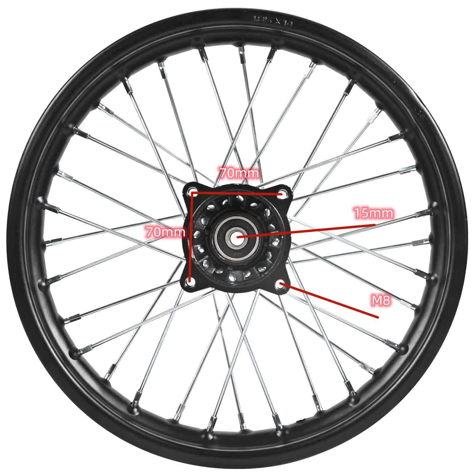 Rueda trasera Trkimal para Motocross Off Road Dirt Pit Bike. Esta rueda está hecha de acero y aleación de aluminio, lo que garantiza durabilidad y resistencia. Con un tamaño de 14 pulgadas y un rodamiento de 15 mm, es compatible con neumáticos traseros de 90/100-14. Adecuada para motocicletas de Motocross Off Road Pit Dirt Rocket Bike de diversas cilindradas, así como para algunas marcas chinas de Pit Bike. No dude en contactarnos si tiene alguna duda o problema, nuestro equipo estará encantado de ayudarle.