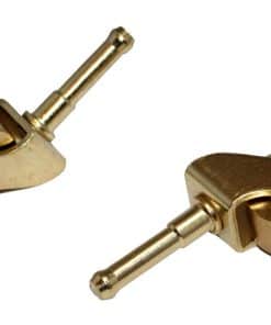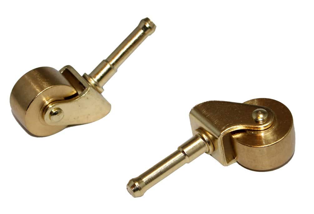 Ruedas de Piano de Latón Macizo para las patas delanteras de su piano espineta, vertical o consola. 1 par (2 ruedas). Estas son unas ruedas muy populares para pianos verticales hechos en América desde la década de 1950 hasta finales de la década de 1990. El diámetro de la rueda es de 1-1/4″. Se incluyen soportes de plástico. La altura de la rueda delantera hasta la parte superior del marco (sin incluir el vástago) es aproximadamente de 1-3/8″. La altura del vástago es de 1-3/4″. El soporte de plástico tiene aproximadamente 1-7/8″ de altura, y se estrecha desde un poco menos de 1/2″ desde la parte superior hasta 3/4″ en la parte inferior.