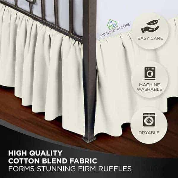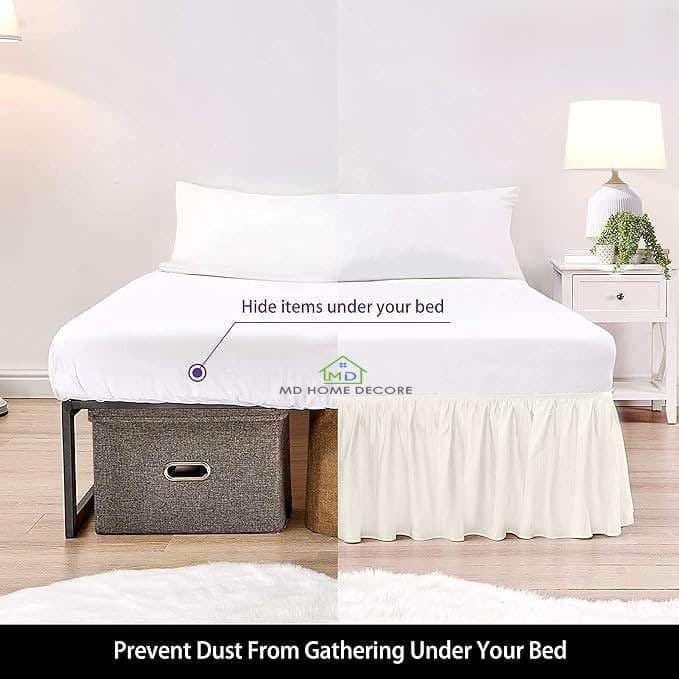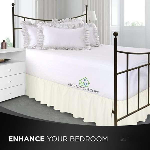 MD Home DecoreEspecializado en diseñar, producir y exportar productos textiles para el hogar para clientes en EE. UU., Nuestro objetivo es proporcionar comodidad adicional, relax y belleza con nuestras sábanas de alta calidad y asequibles. Respaldados con fábricas OEKO-TEX y un equipo profesional de abastecimiento, desarrollo y diseño.Falda de Cama con Volantes :- ¡Un Toque Perfecto para tu Cama!Mejora la apariencia de tu dormitorio con esta falda de cama con volantes. Hecha con una mezcla de algodón y poliéster, esta falda de cama de calidad premium se usa bien y es duradera. La falda de cama MD Home Decore está elegantemente con volantes alrededor de tres lados con esquinas divididas y funciona mejor en camas con postes de cama que interfieren con las faldas de cama ordinarias.Características Detallada con volantes en tres lados para un aspecto lujoso Tela sólida decorativa de alta calidad Esquinas divididas Hecho en IndiaDetalles del Producto Material: Microfibra Método de Limpieza: Lavado a MáquinaMúltiples tamaños y colores Con 10 colores para elegir, estas faldas de cama combinan bien con la mayoría de los conjuntos de ropa de cama. Elige el tamaño que se ajuste a tu cama. Tenemos todos estos tamaños de cama: falda de cama individual, falda de cama doble, falda de cama queen, falda de cama king, falda de cama cal king.Cuidado Fácil Hechas de una mezcla de poli/algodón fácil de cuidar, estas faldas de cama son resistentes a las arrugas y a la decoloración. Lavar a máquina en agua fría, secar en secadora a baja temperatura.