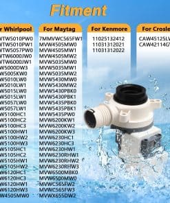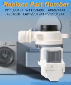 Este ensamble de bomba de drenaje de lavadora reemplaza los números de parte W11399437 W11259498 4961028 AP6974144 EAP12731241 PS12731241. Funciona eficientemente para solucionar ruidos inusuales, fugas, drenaje deficiente, o fallos en la bomba de drenaje de su lavadora. El motor de la bomba de drenaje está construido con alambre de cobre de alta calidad para garantizar un funcionamiento eficiente. Además, utiliza tecnología impermeable de alta precisión y materiales impermeables premium, junto con un anillo de sellado compatible, lo que resulta en una vida útil excepcionalmente larga. Compatible con lavadoras Whirlpool, Maytag, Kenmore y Crosley.
