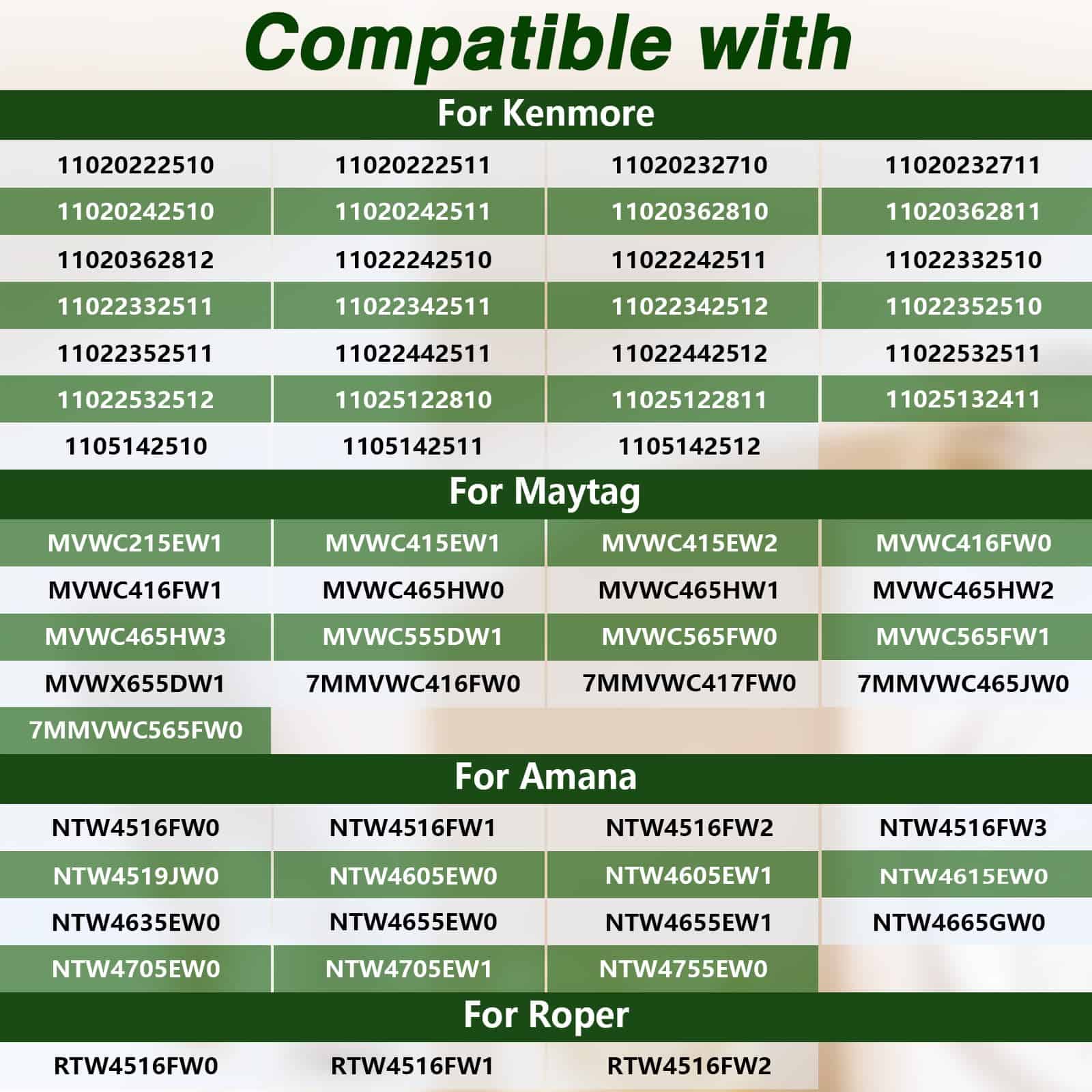 4. Compatible con: Apto para Crosley CAW11544EW1, CAW11544EW2, CAW8350EW2, VAW3584GW0, VAW3584GW1; Apto para Lnglis ITW4671EWO, ITW4771EW0, ITW4871FWO, ITW4871FW1, ITW4871FW2, ITW4880HW0, ITW4971EW0, ITW4971EW1; Apto para Roper RTW4516FW0, RTW4516FW1, RTW4516FW2; Apto para Kenmore 11020222510, 11020222511, 11020232710, 11020232711, 11020242510, 11020242511, 11020362810, 11020362811, 11020362812, 11022242510, 11022242511, 11022332510, 11022332511, 11022342511, 11022342512, 11022352510, 11022352511, 11022442511, 11022442512, 11022532511, 11022532512, 11025122810, 11025122811, 11025132411, 1105142510, 1105142511, 1105142512.