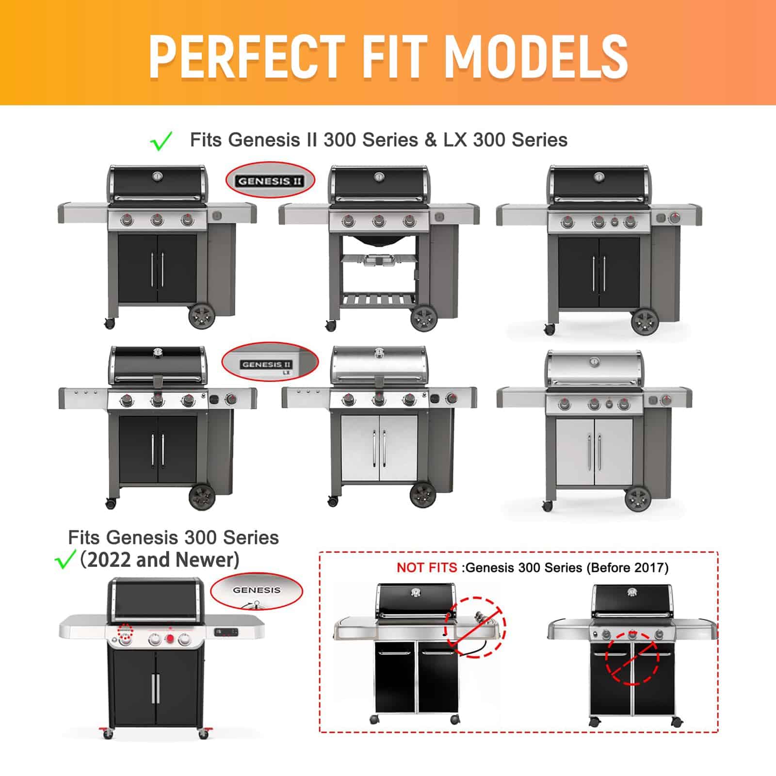 2. Compatible con Parrillas Weber Genesis II LX 300 Series: Las partes genesis ii e-310 para Weber Genesis ii LX S-340, Weber Genesis ii LX E-340, Weber Genesis ii CSE-315, Weber Genesis ii CSS-315, Weber Genesis ii CSS-335, Weber Genesis ii CSE-335, Weber Genesis ii LX CSS-340, Weber Genesis ii LX CSE-340 (2017 en adelante). Reemplazar por las partes de parrilla Weber GS4 66795 66032.
