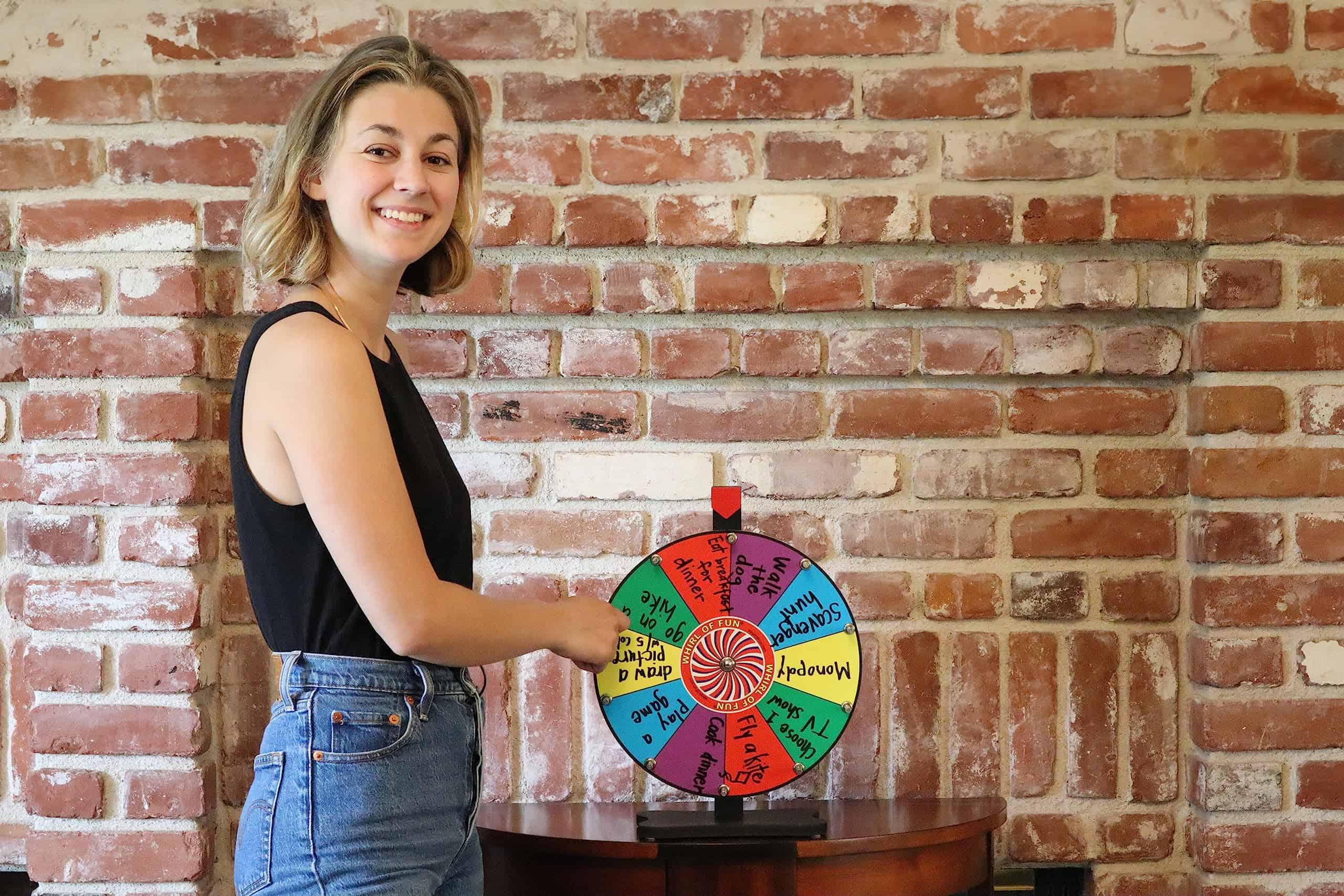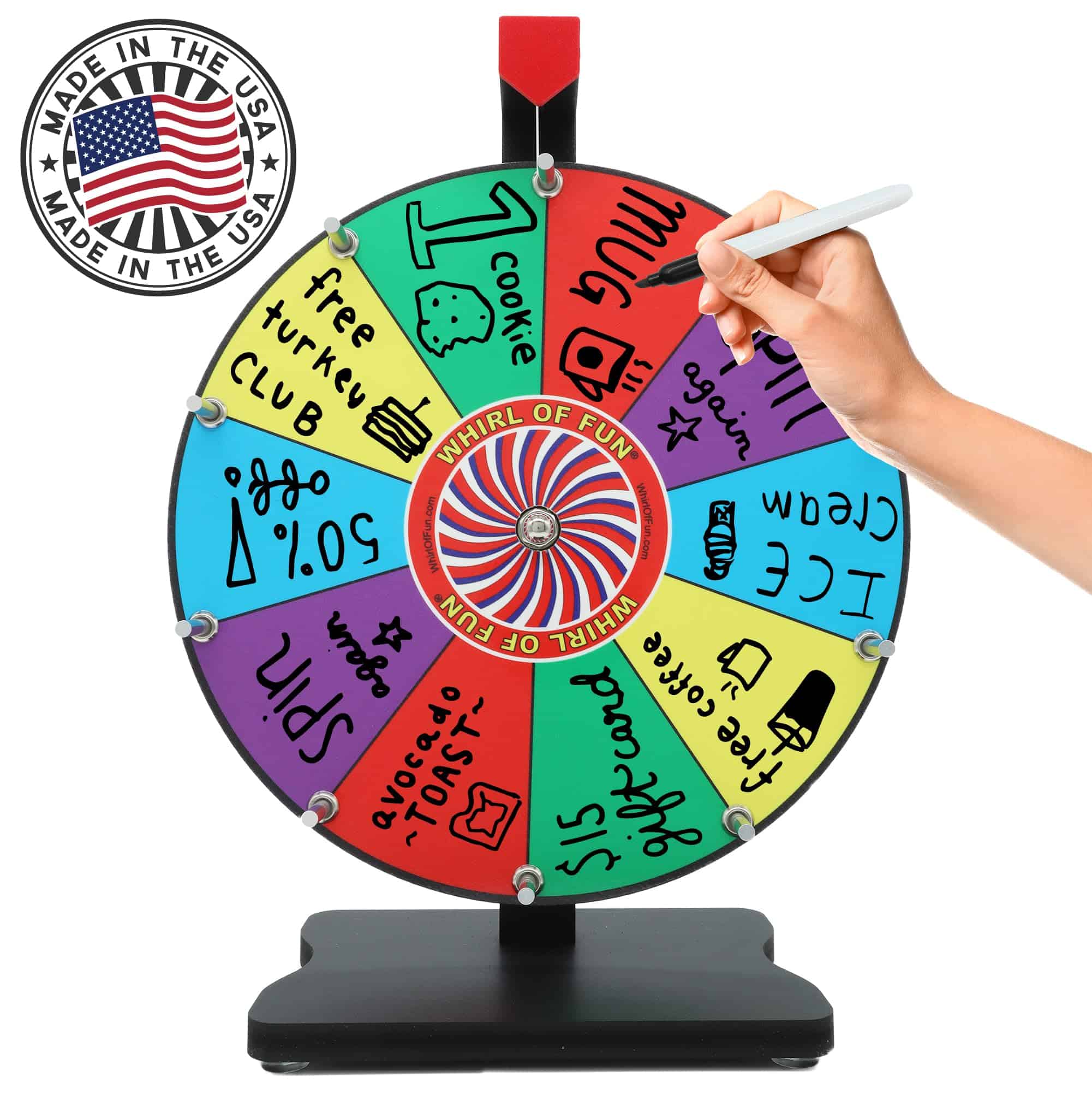 Sin Preocupaciones. Nuestra ruleta de premios está construida para durar. Entendemos lo frustrante que es llegar a tu evento y que tus planes se arruinen porque la frágil ruleta de premios se rompe o se desmonta. Eso no sucederá con la Ruleta de Premios Whirl of Fun. El producto fue diseñado para ser sólido y fiable. Los rodamientos de bolas duraderos mantienen tu rueda girando libremente. Los tornillos no se caerán durante el uso. Los pasadores están hechos de aluminio de alta calidad y no se oxidarán. La base estable y resistente con pies antideslizantes mantiene tu ruleta de premios sólidamente en su lugar.