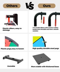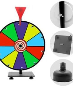 Soporte y poste resistente de alta resistencia Doble rodamiento de acero inoxidable para un giro suave y equilibrado Los pernos de acero inoxidable son duraderos y atractivos ¡Controla la duración de tu giro! 10 ranuras habilitadas para personalización Premio de color para texto más fácil de limpiar, mayor dureza, más resistente al desgaste Los sonidos de «clic» agregan emoción y atraen a las multitudes Soporte desmontable para un almacenamiento fácil y un montaje conveniente
