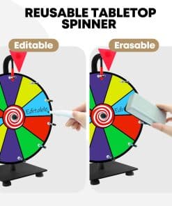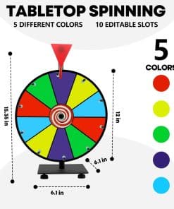 Nuestra ruleta de premios colorida de mesa de 12″ tiene 10 ranuras habilitadas para personalización de color y viene con una superficie de borrado en seco para texto. Puedes escribir en la ruleta de premios con tu mensaje personalizado o dejarlo en blanco. Además, nuestra ruleta de premios está hecha para durar. Utilizamos buenos materiales, bases de hierro engrosadas y clics de acero inoxidable más duraderos. Doble rodamiento de bolas de precisión para un giro suave. Y nuestra ruleta de premios en color tiene 2 tipos de clicadores, ¡los sonidos de «clic» ayudan a aumentar la emoción e atraen a las multitudes!Nuestra ruleta fue diseñada para ser robusta y confiable y perfecta para centros comerciales, actividades navideñas, carnavales, ferias comerciales, reuniones anuales y fiestas, etc.