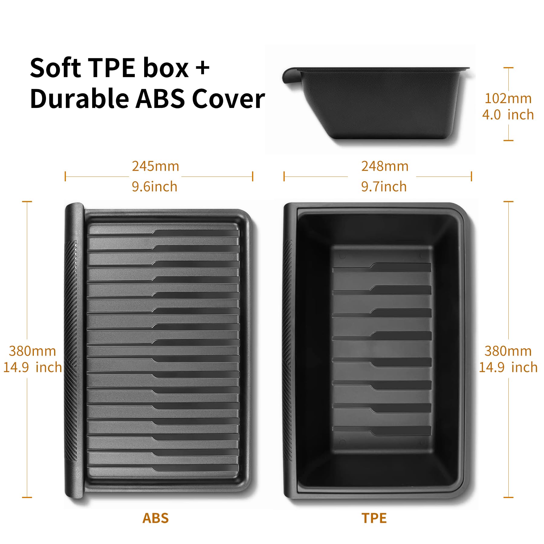 2. Material de Calidad Premium Esta caja de almacenamiento bajo el asiento para el modelo Y está fabricada con un nuevo material ecológico de TPE y tapa premium de ABS, que es resistente a altas temperaturas y sin olor. El suave material de TEP le permite lavar la caja de almacenamiento de forma conveniente, y el material en sí tiene un cierto efecto de absorción de impactos, lo que resuelve perfectamente las deficiencias de la limpieza problemática de la caja de almacenamiento de tela de fieltro y del pobre efecto de absorción de impactos. El material de la tapa es ABS, más duradero.