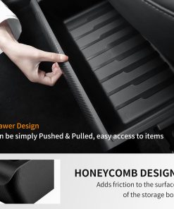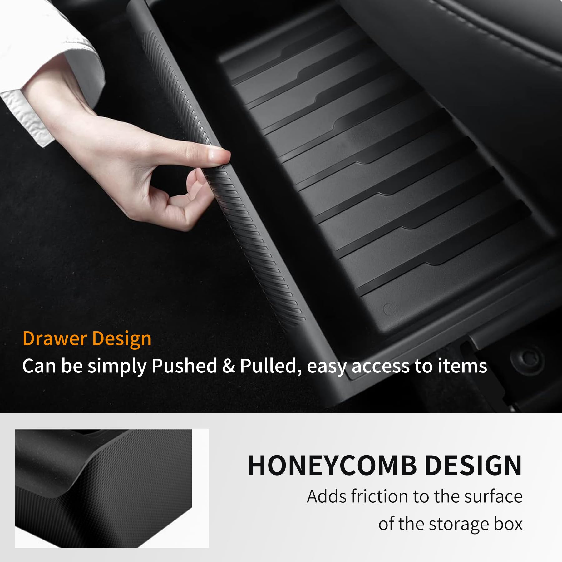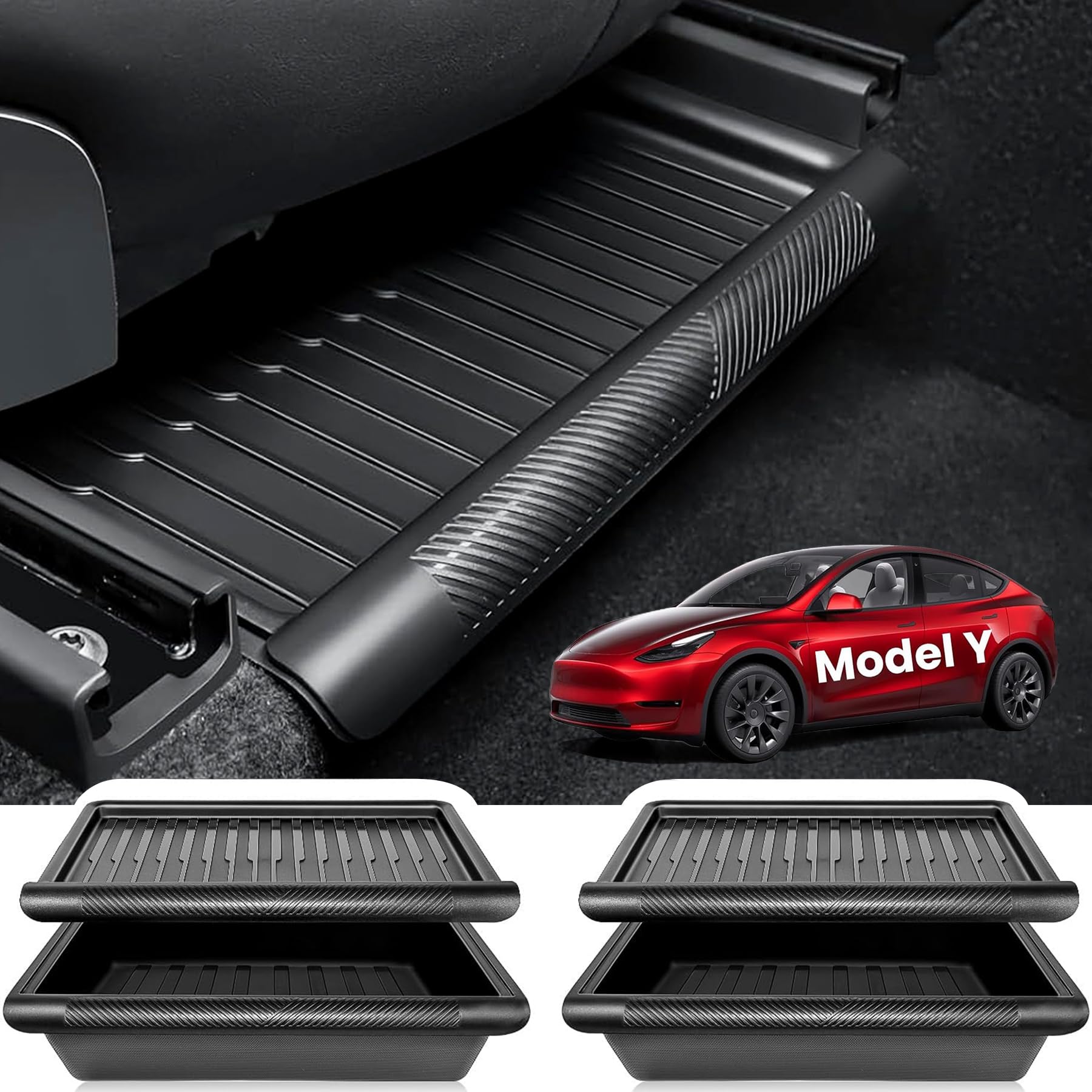 5. Instalación Fácil El organizador oculto de almacenamiento bajo el asiento del Modelo Y puede deslizarse sin esfuerzo en el Modelo Y en pocos segundos, ¡ajustarse firmemente y permanecer seguro en su lugar! El diseño de caja de almacenamiento deslizable oculta permite tirar y empujar fácilmente, proporcionando un acceso conveniente a sus artículos almacenados. Compatible tanto con tapetes genéricos como con modelos oficiales de Tesla. (Nota: No es compatible con tapetes de suelo extendidos debajo del asiento).
